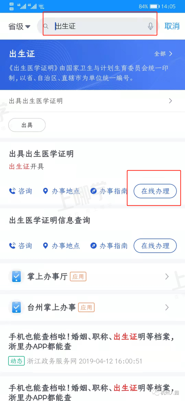 或者直接从浙里办APP进入,搜索“出生证”-在线办理。