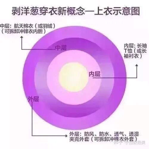 剥洋葱穿衣公式:穿衣温度=26℃-室温内层材质柔软、透气排汗+中层保暖+外层防风、防雨