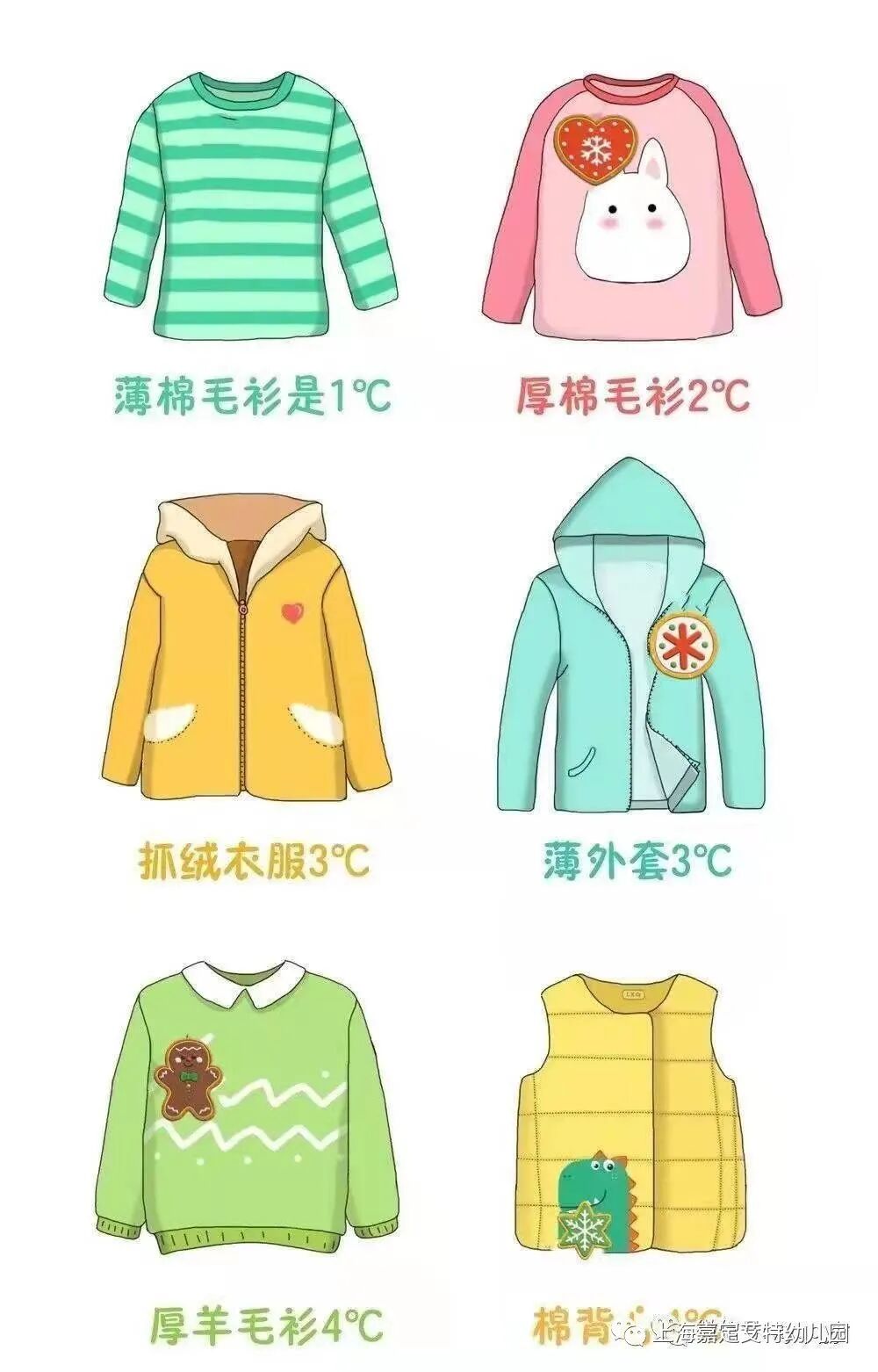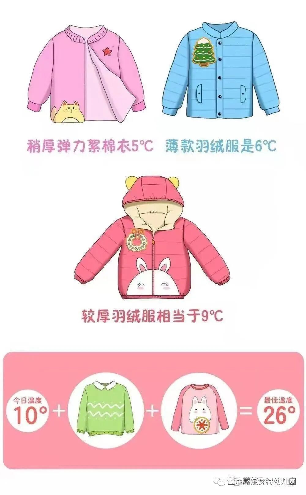 例如,今天的温度为22℃,则穿衣温度=26-22=4=1+3,那么给孩子穿一件薄棉衫(1℃)+一件抓绒衣服或薄外套(3℃)即可。(注:此穿衣公式仅供参考,每个孩子体质情况不一样,家长可根据天气和孩子自身体质酌情增减衣物。)