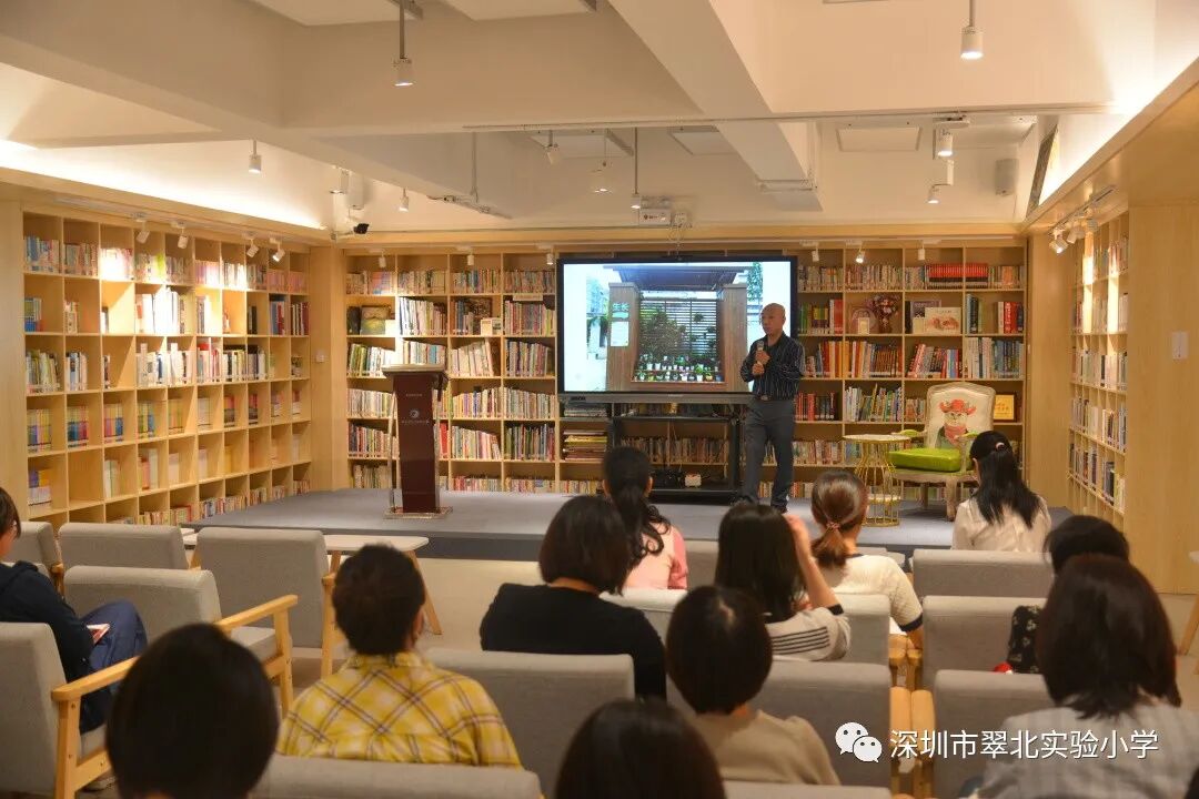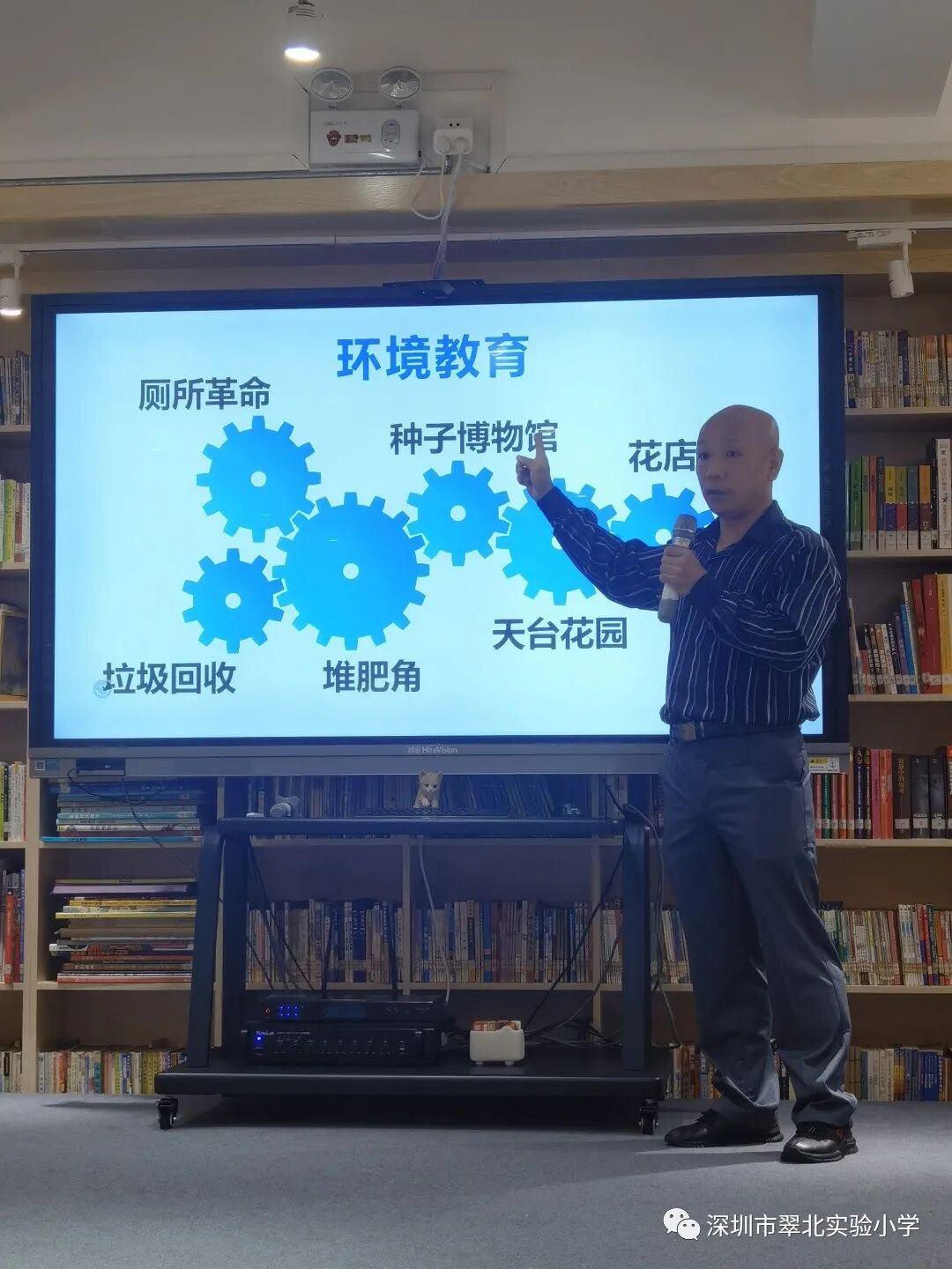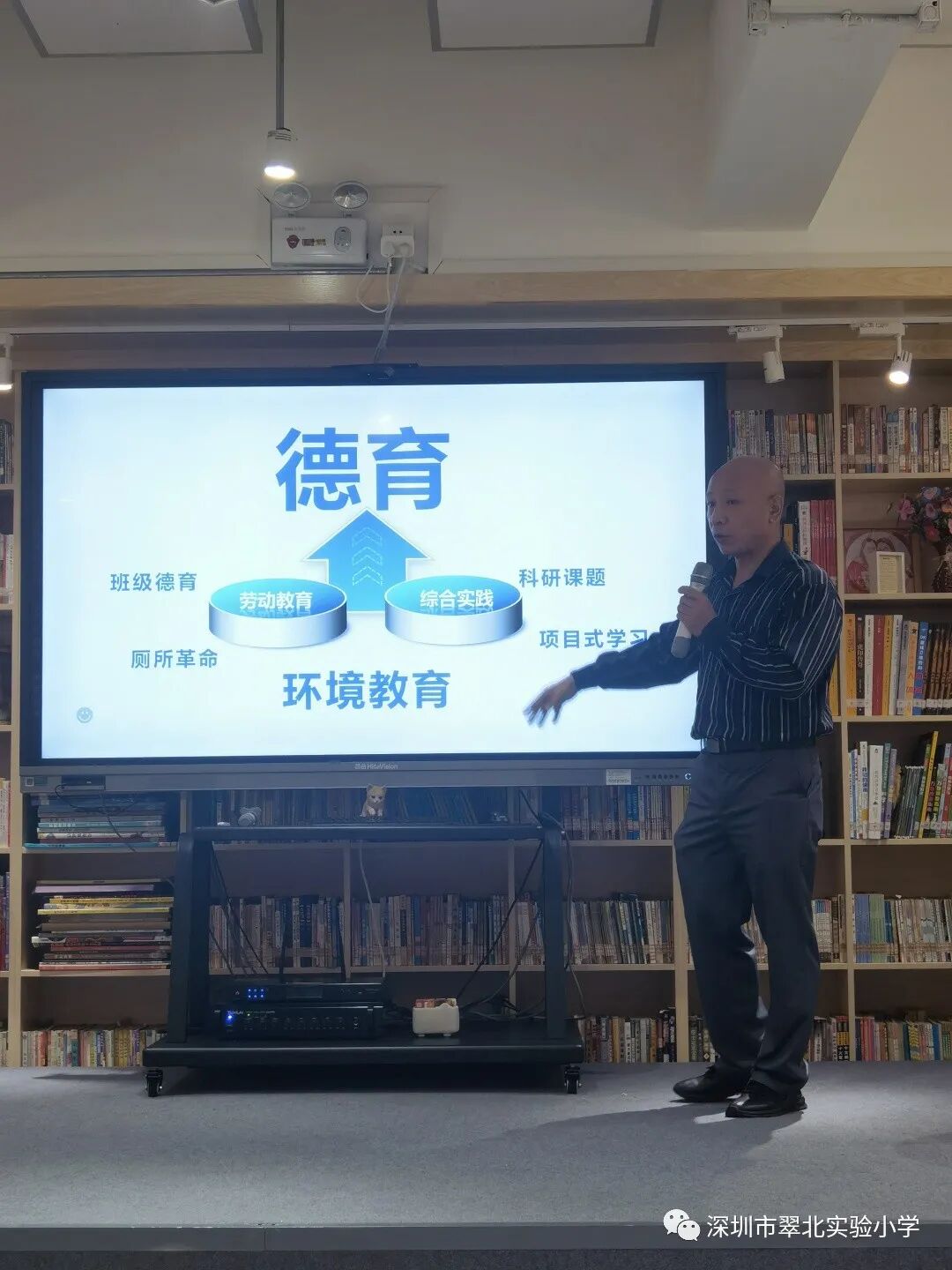 张老师还介绍了学校“节水项目小组”开展“布吉河的调查”统计学校用水数据等实践活动进行劳动课程设计的案例,以及让学生筹备玩具商店,并模拟商店经营模式,让学生去使用真实钱币开展购买、出售等体验活动,最后将活动变为课程,以此启发老师们将社会真实场景链接项目研究开发课题,丰富学校的课程建设。张老师说,“做有翠北特色的德育,要善于将劳动教育与综合实践有机结合起来,主动开发班级科研小课题,形成从动机到行动到评价到习惯的完整育人链条和科研成果。教师要发挥课程育人的主渠道作用,利用好校园内外场地空间,带领学生在看得见、摸得着的真实场景中夯实核心素养。譬如,利用学校的“厕所革命““种子博物馆”“牛奶盒回收站““堆肥角”“天台花园”等资源开发内容多样、形式丰富的校本课程。