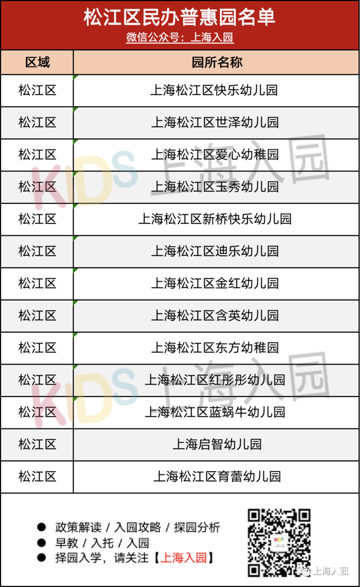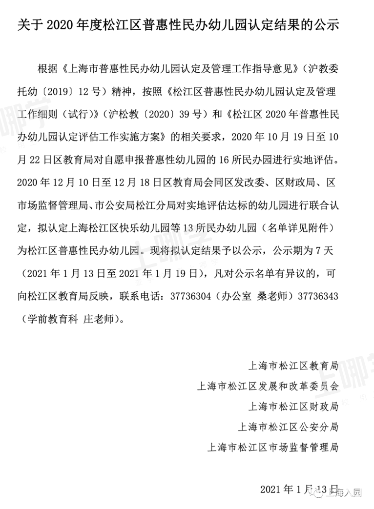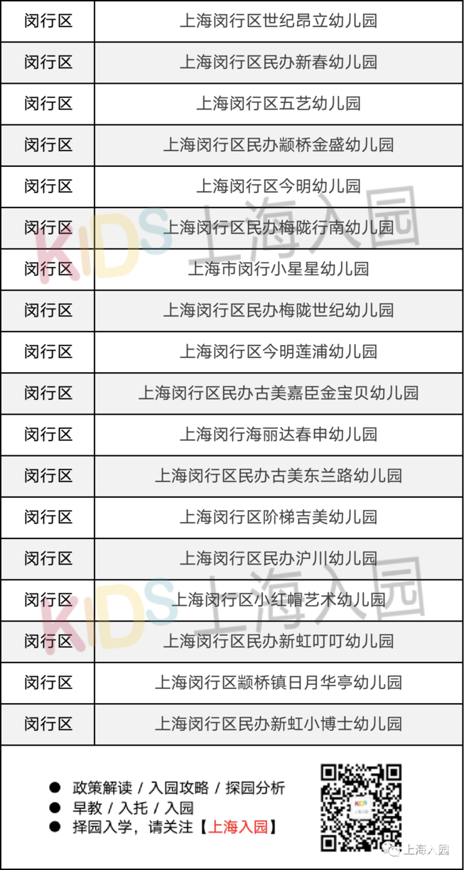 ▲(图片来源:闵行区教育局)闵行区认定为普惠性民办园的数量最多,足足有76所,具体的名单如下:新时代幼儿园的办园理念是:以“人性化、国际化、现代化”为主题,以“英语、日语、艺术”为特色,采用小班化、个别化、精细化、情感化的互动教学方法,满足境内外人士子女接受高质量教育的需求,满足小区幼儿入园需求。在转为普惠园以后,根据闵行区教育局公示的信息,新时代幼儿园的学费从4800元/月降到4000元/月,还是很不错的。根据今年松江区教育下发的文件中,总共有13所民办园被认定为惠普性幼儿园,具体名单如下: