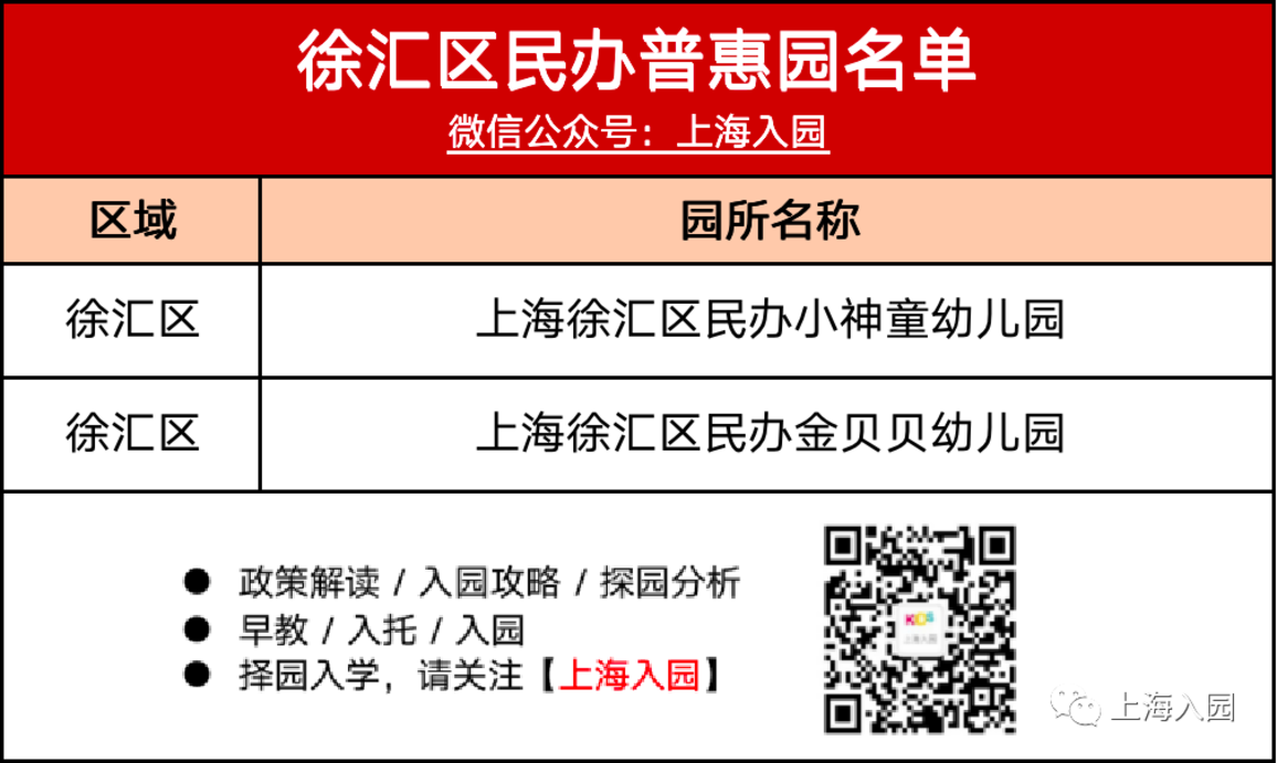 爱心幼稚园创办于2002年,幼儿园将共同性课程和园本特色课程相融合,在幼教改革的事业中走出了具有民办特色的发展之路。2021年招生托班、小班、中班、大班。金豆豆幼儿园占地面积2413平方米,建筑面积1587平方米,幼儿园拥有开阔的户外活动场地:1000平方米的大草坪,多种漂亮、安全的大型运动器械和户外塑胶场地。幼儿园包含托、小、中、大班。每周定期开展“小马合唱团”、“汪齐凤芭蕾”、“小足球”、“跆拳道”等特色项目活动。上海徐汇区民办小神童幼儿园创办于2008年,面积1383平方米,是一所普惠性民办幼儿园。我园曾获得“2017-2018学年度上海市安全文明校园”的称号;2019年被选入第二批”上海市依法治校标准校”。幼儿园以音乐、美术艺术为特色,招收本市、外省市、港澳台及境外适龄幼儿。以上就是入园君手动搜集到的各区民办普惠园名单,部分没有涉及到的区,例如浦东,欢迎各位家长补充!