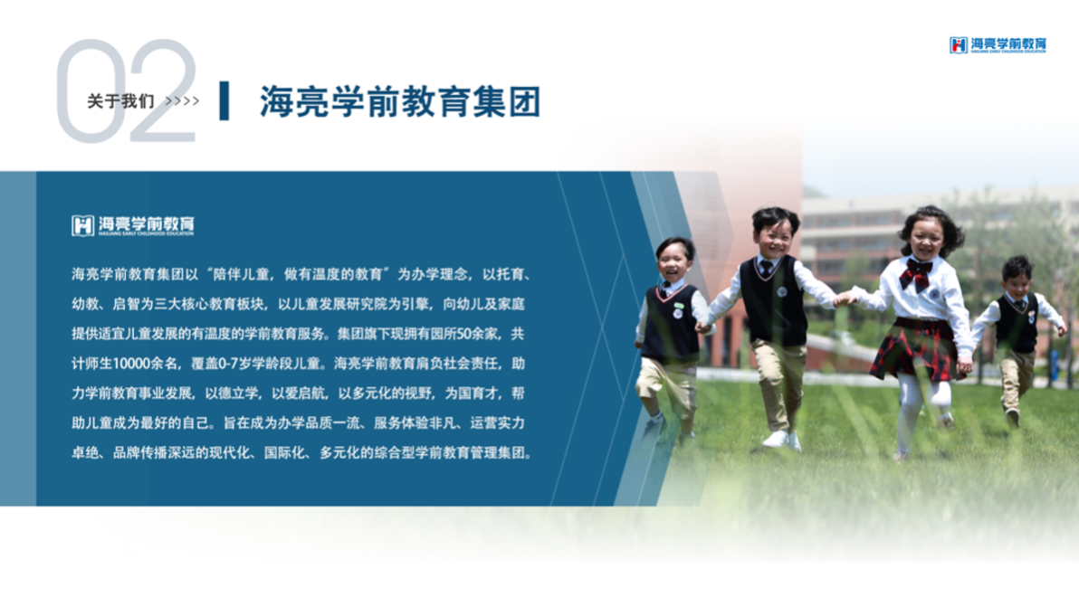 海亮学前教育集团以“陪伴儿童,做有温度的教育”为办学理念,以托育、幼教、启智为三大核心教育板块,以儿童发展研究院为引擎,向幼儿及家庭提供适宜儿童发展的有温度的学前教育服务。集团旗下现拥有园所50家,共计师生10000余名,覆盖0-7岁学龄段儿童。海亮学前教育肩负社会责任,助力学前教育事业发展,以德立学,以爱启航,以多元化的视野,为国育才,帮助儿童成为更好的自己。旨在成为办学品质一流、服务体验非凡、运营实力卓绝、品牌传播深远的现代化、国际化、多元化的综合型学前教育管理集团。