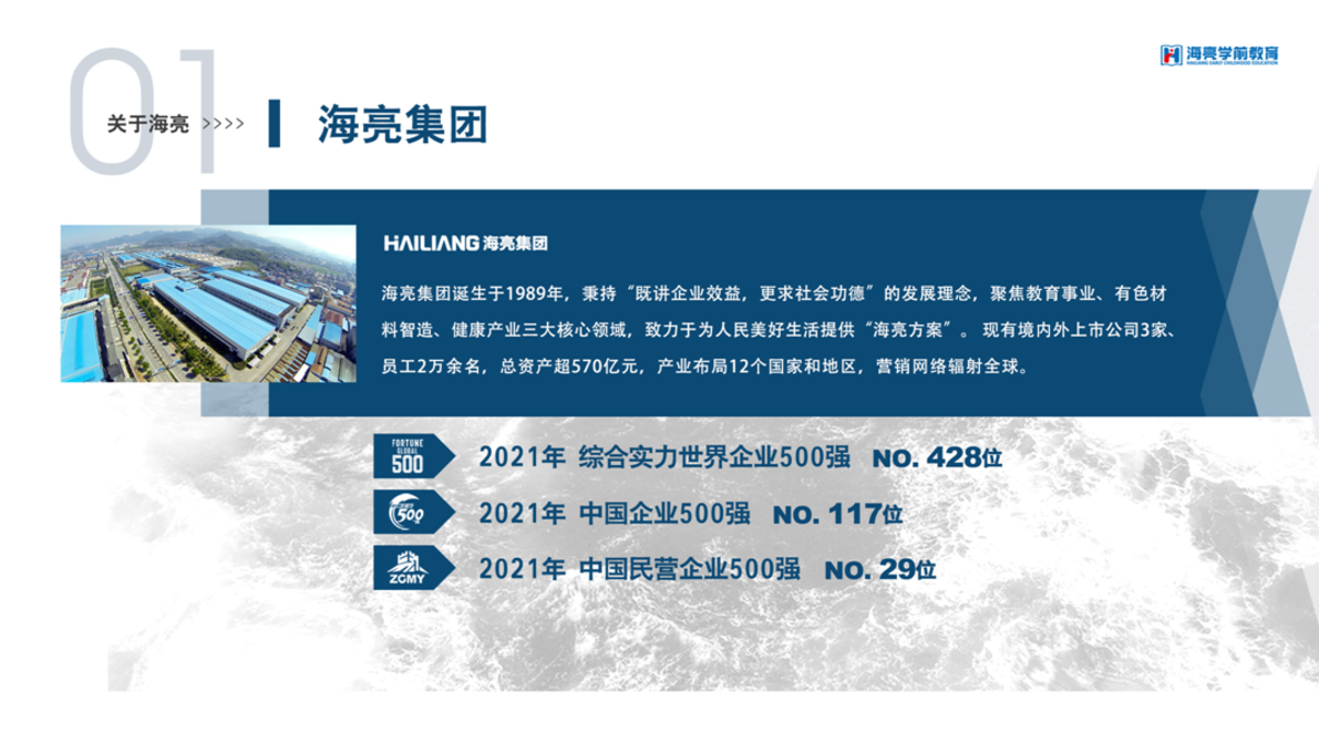 海亮学前教育集团隶属于世界500强海亮集团。集团管理总部位于杭州市滨江区,现有境内外上市公司3家、员工2万余名,总资产超570亿元,产业布局12个国家和地区,营销网络辐射全球。