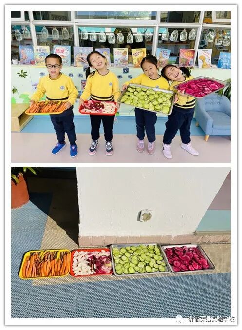 我们发现:萝卜被风吹了会变干,于是我们把切出来的萝卜拿到太阳底下晒成萝卜干。