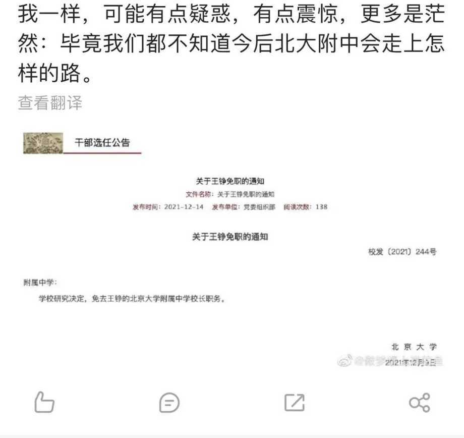 通知非常简短,全文只有一句话:“附属中学:学校研究决定,免去王铮的北京大学附属中学校长职务。”落款为北京大学,时间为2021年12月9日。