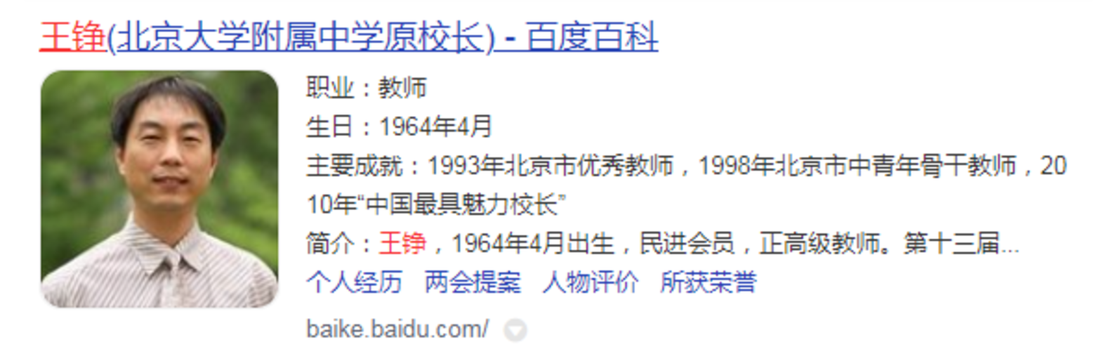 12月15日,百度百科中关于王铮的词条中,已显示“北京大学附属中学原校长”。