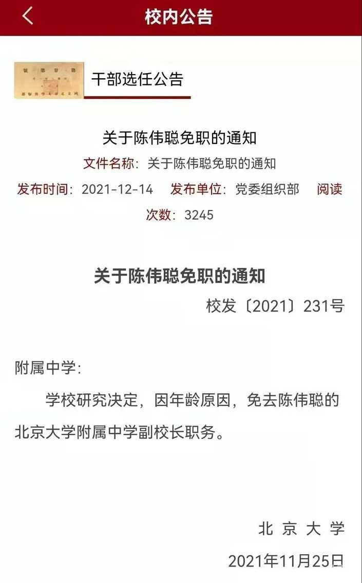 通知全文如下:“附属中学:学校研究决定,因年龄原因,免去陈伟聪的北京大学附属中学副校长职务。”落款为北京大学,时间为2021年11月25日。