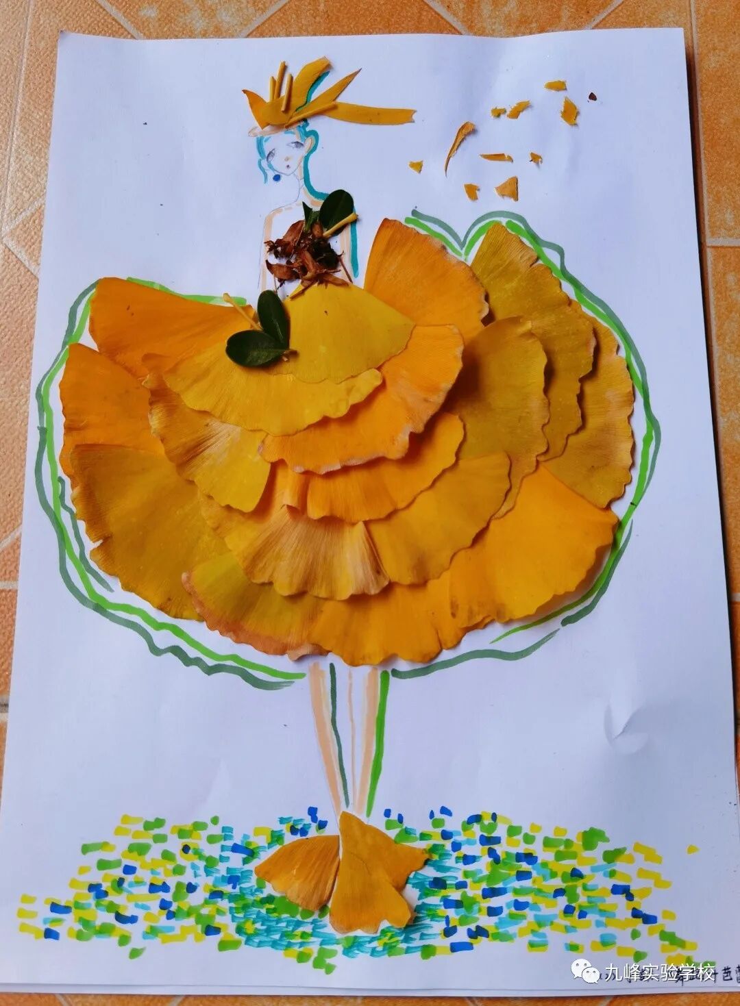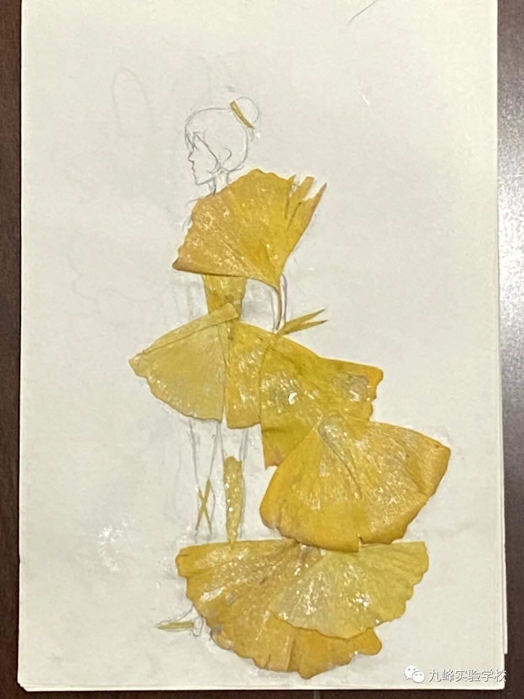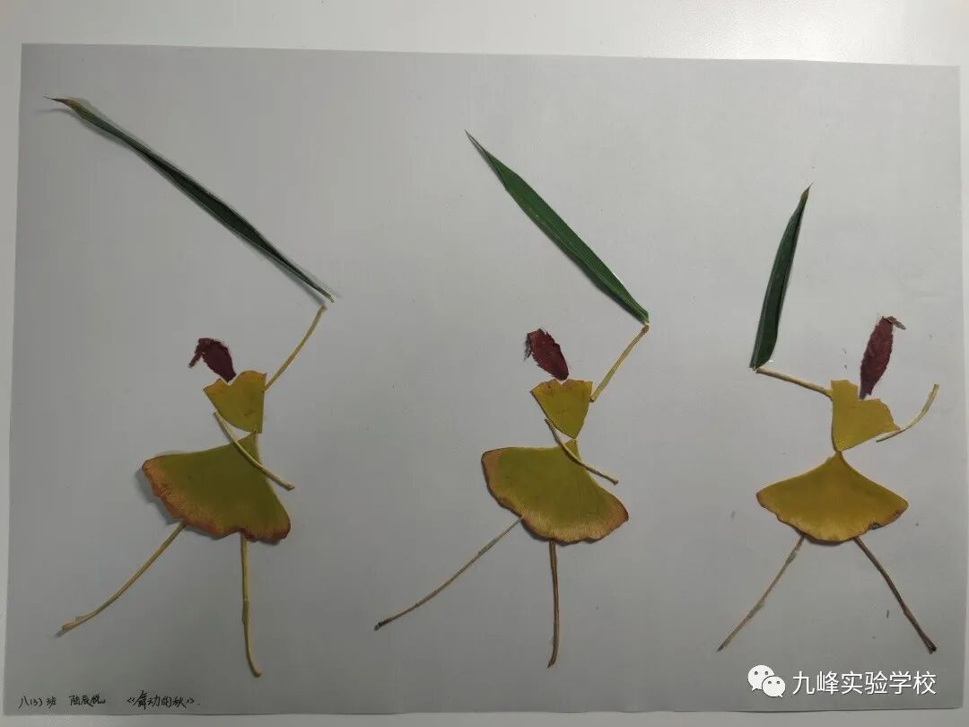 俯身拾起金黄的叶片,仔细观察它的形状、纹理,同学们用银杏叶制作了造型各异的花束、人物图案等。一双双巧手,丰富的想象力,精美的构图,小小的叶片在同学们手中重新焕发生机。