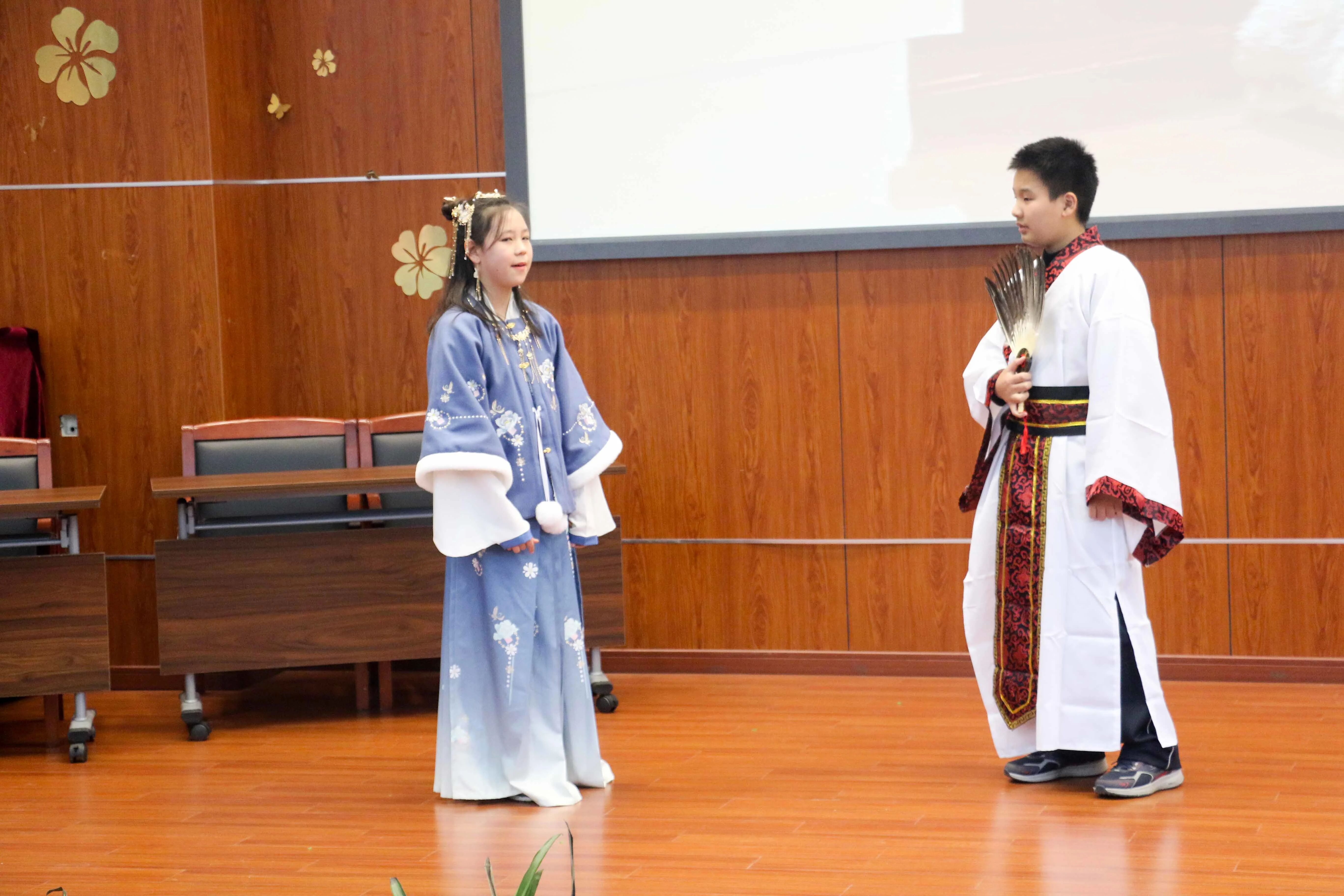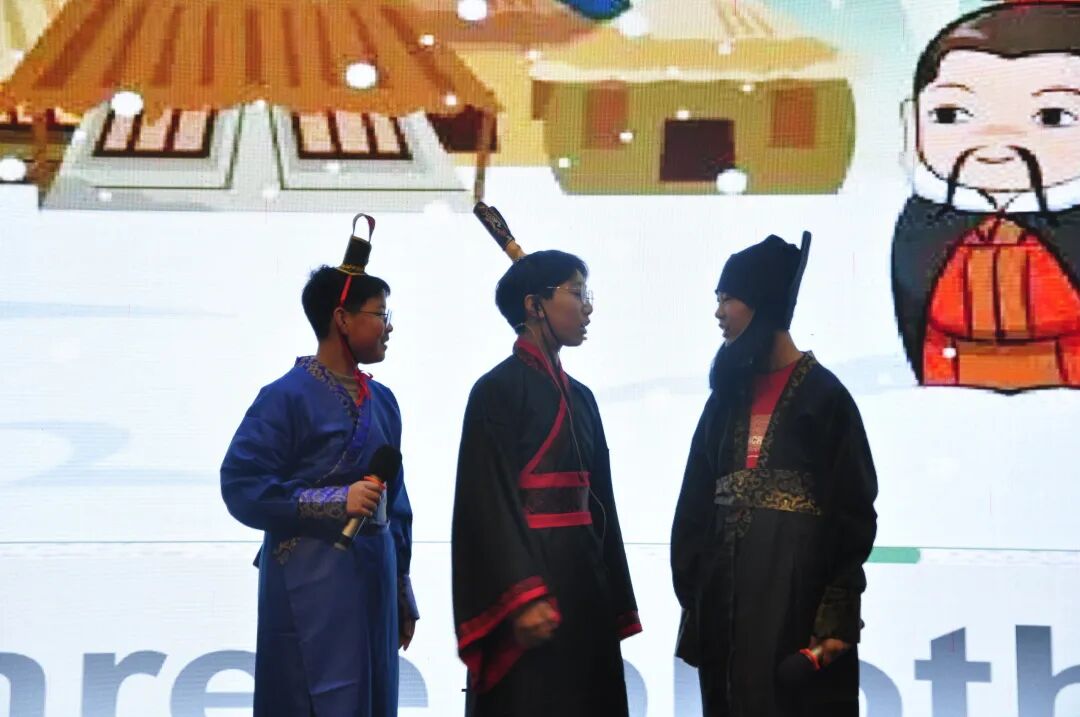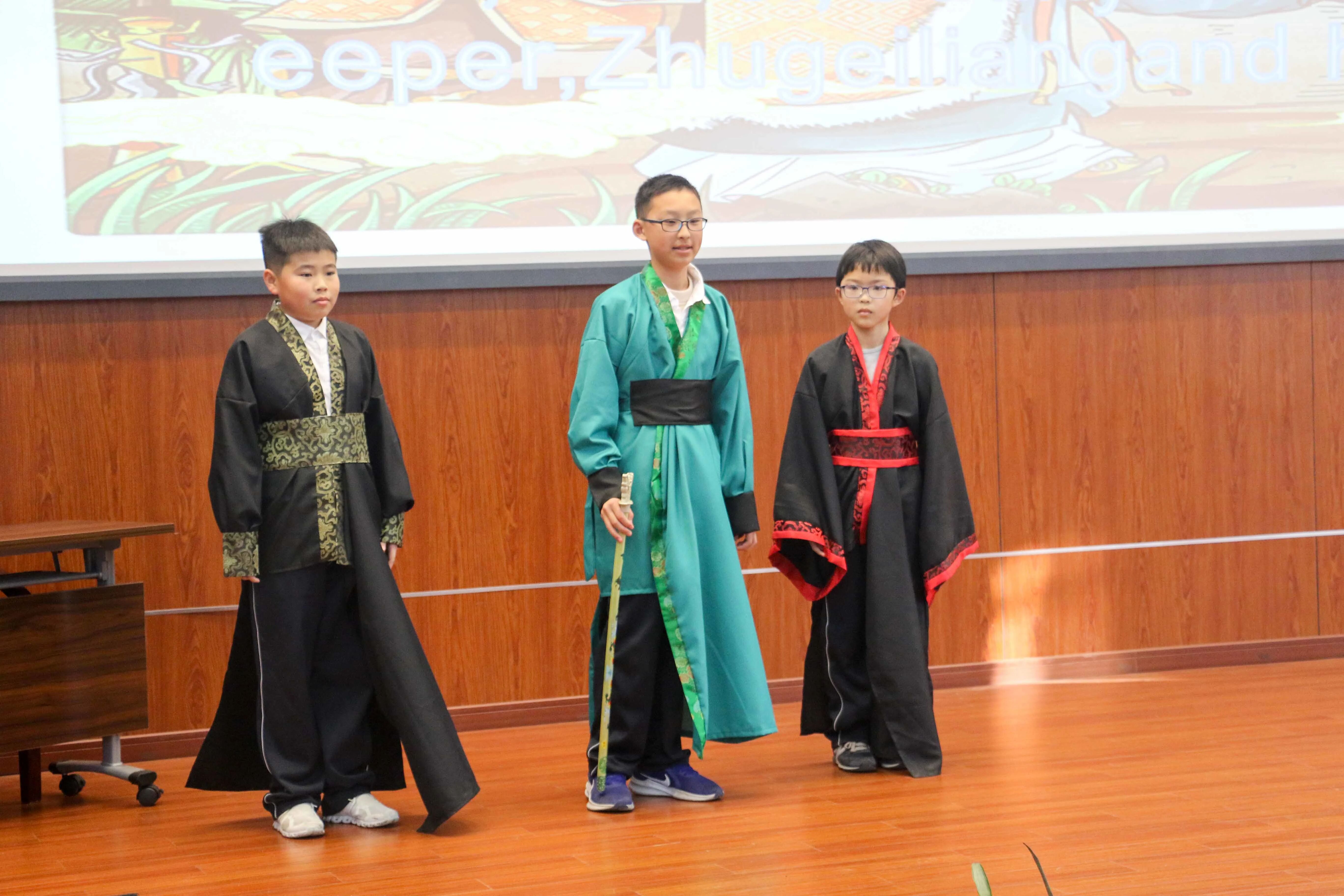 六年级课本剧比赛以中华传统故事为依托,要求小演员们用英语展现完整的故事情节,并表达当下的人物情感。在本次课本剧比赛中,学生们表演了中华传统小故事《曹冲称象》、《嫦娥奔月》、《三顾茅庐》和《自相矛盾》等。