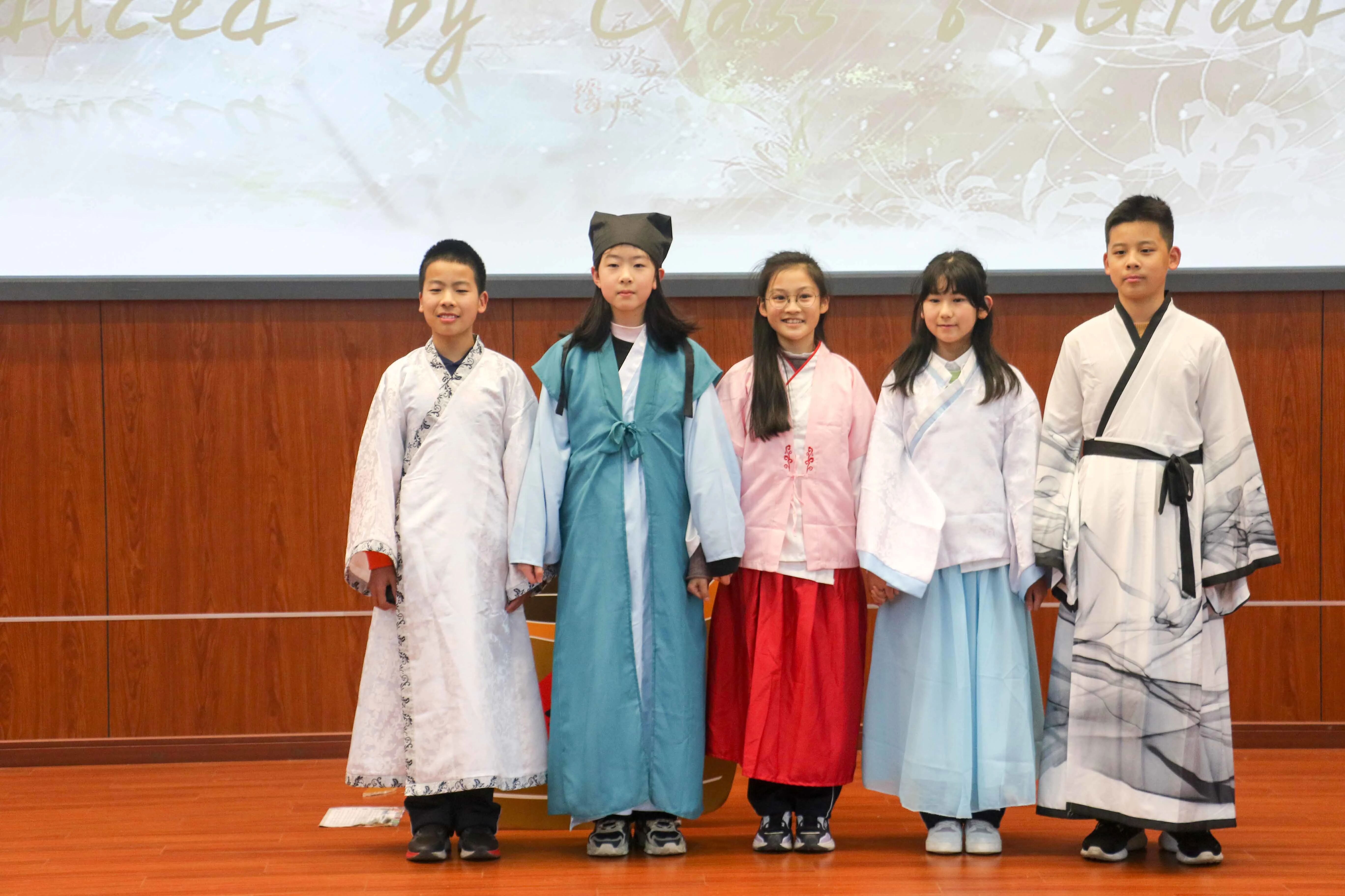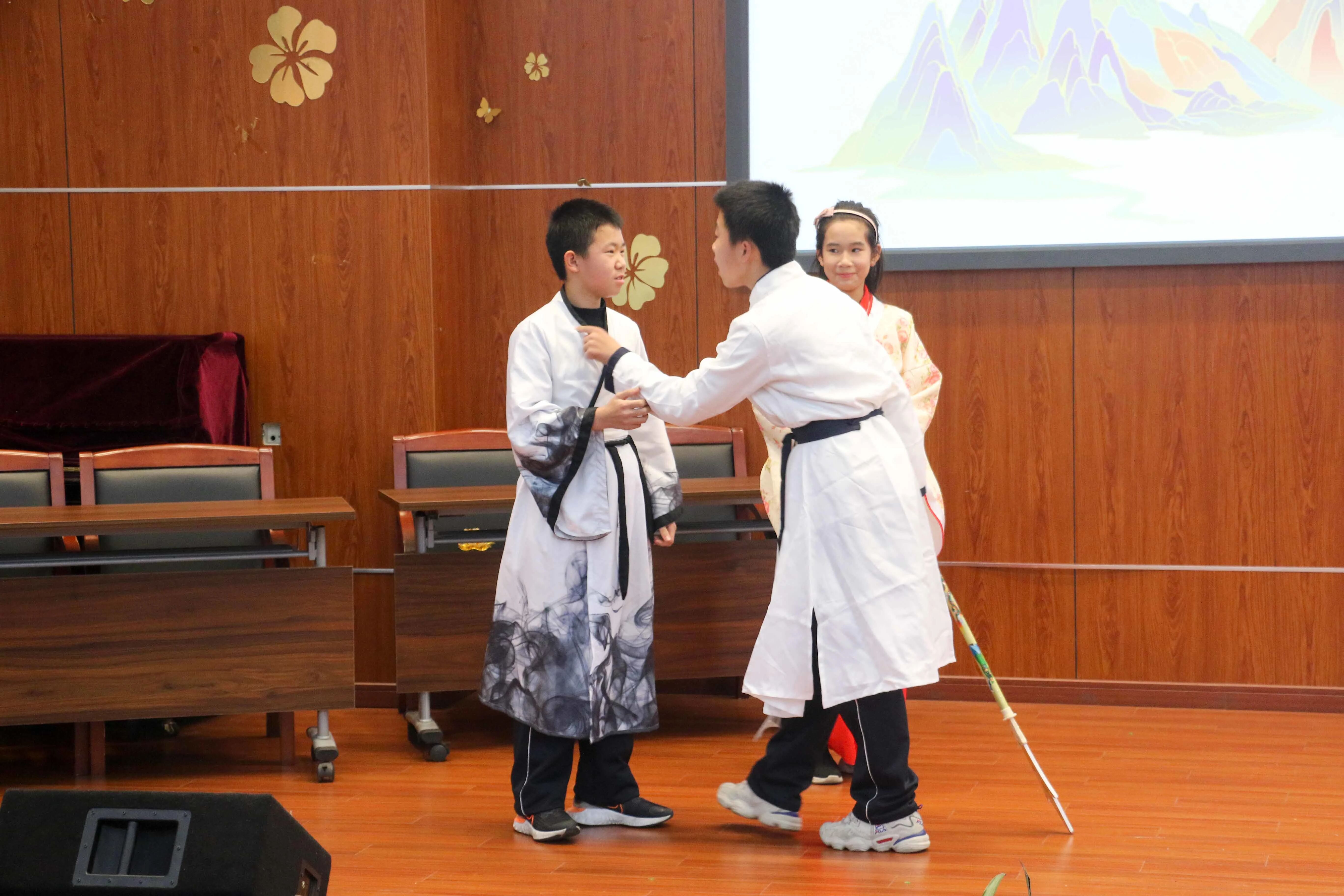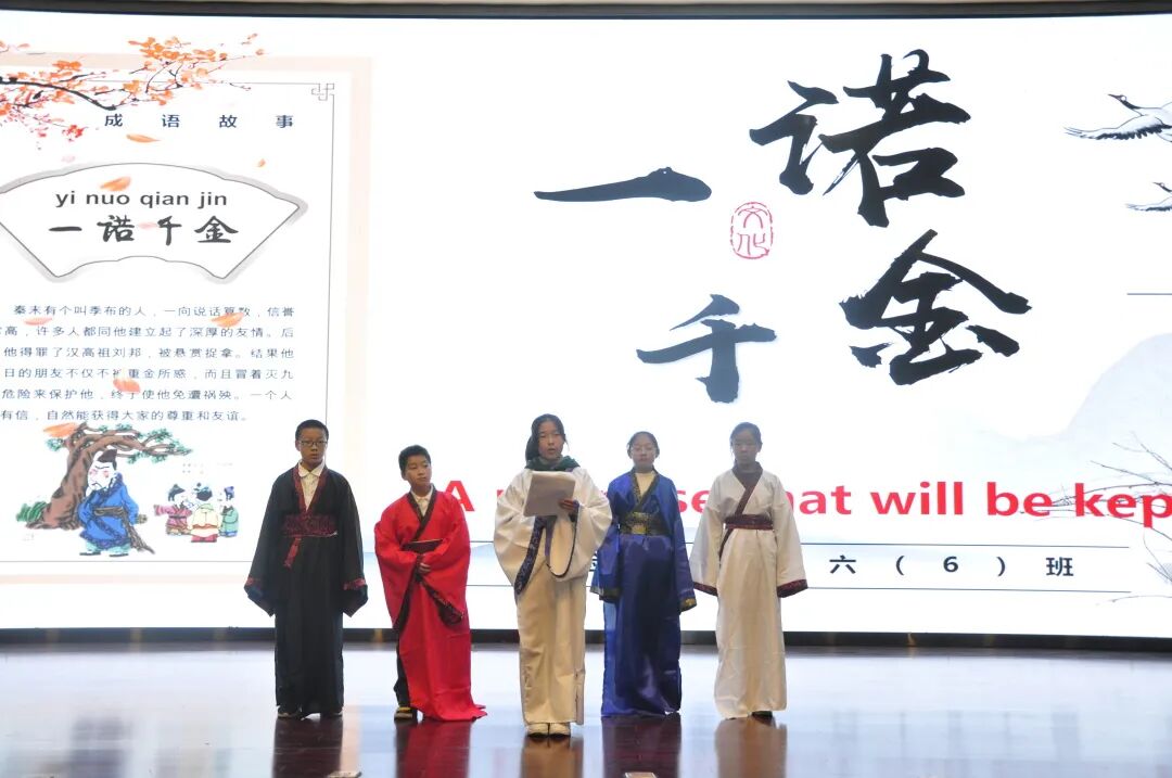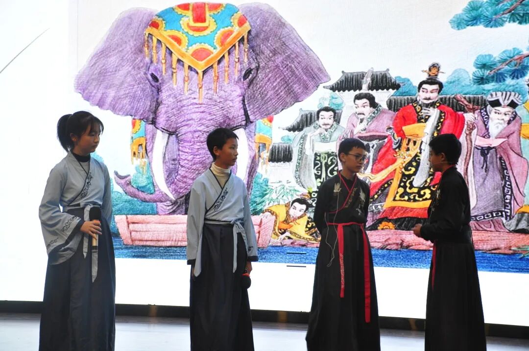 六年级课本剧比赛以中华传统故事为依托,要求小演员们用英语展现完整的故事情节,并表达当下的人物情感。在本次课本剧比赛中,学生们表演了中华传统小故事《曹冲称象》、《嫦娥奔月》、《三顾茅庐》和《自相矛盾》等。