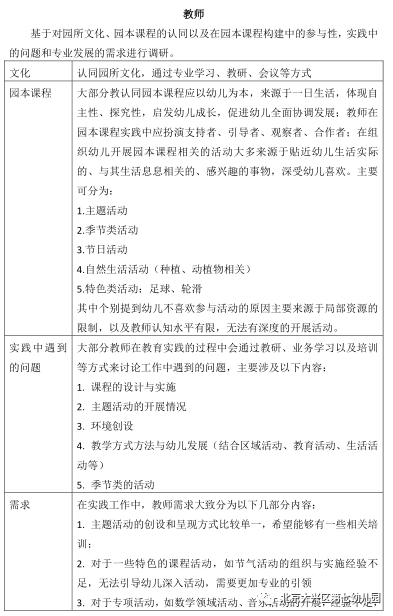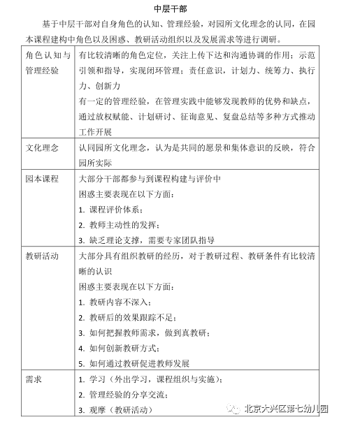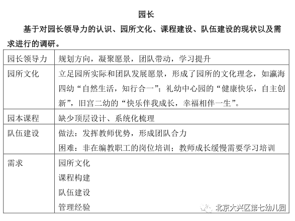 在大兴区幼儿园教育集团成立暨授牌仪式后,大兴七幼教育集团在12月对各成员园进行了现状调研和分析,从园长、干部、教师三个维度,分别就园长领导力、干部角色认知和管理经验、园所文化理念、园本课程、队伍建设、教研活动、实践问题以及专业发展需求等进行了不同层次的调查。通过分析,明确各园的发展优势、发展阶段与定位、问题困惑与需求等,在此基础上进行详细规划。