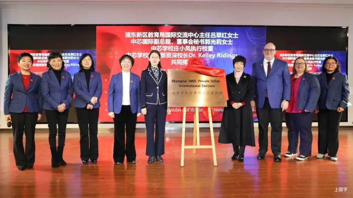 浦东新区教育局国际交流中心主任吕翠红女士、中芯国际副总裁、董事会秘书郭光莉女士、庄小凤执行校董、Dr. Kelley Ridings校长共同为中芯学校国际部揭牌,全体校领导上台见证揭牌。