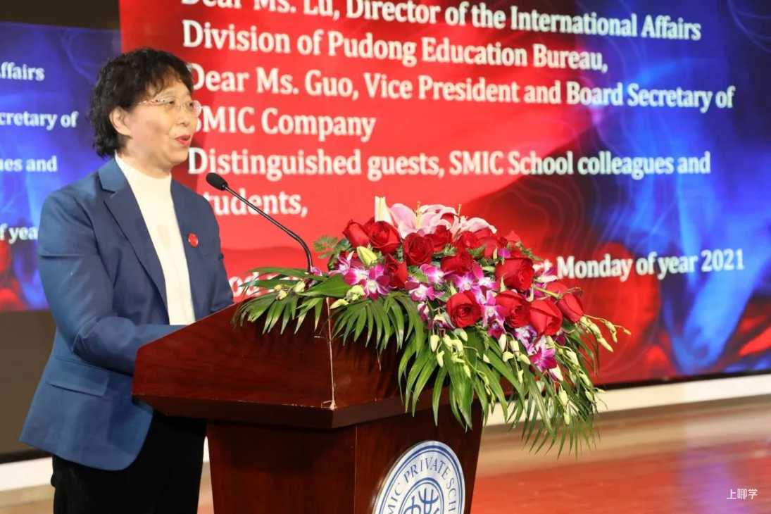 On December 27, 2021, Shanghai SMIC Private School held a renaming ceremony for its English Track after receiving official government approval of its change in status to International Division. Ms. Cuihong Lü, Director of the International Exchange Center of Pudong Education Bureau, Ms. Guangli Guo, Vice President and Board Secretary of SMIC Company, Chancellor Flora Zhuang of SMIC School, other school leaders, and teacher and student representatives from across the school joined the ceremony to witness the unveiling of the new SMIC International Division designation. Other teachers and students watched the live ceremony online.