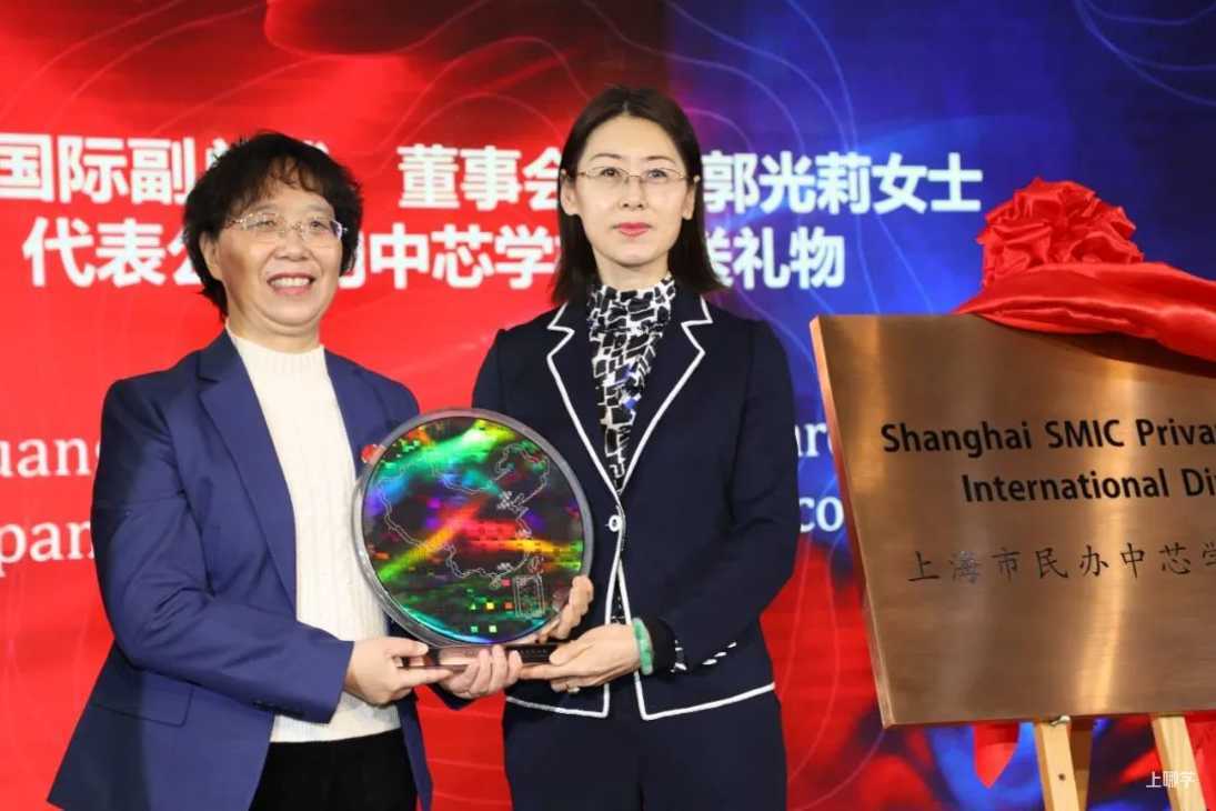 On behalf of the SMIC Company, Ms. Guo presented a 12-inch wafer to the school as a special congratulatory gift that Chancellor Zhuang accepted on behalf of the SMIC School.
