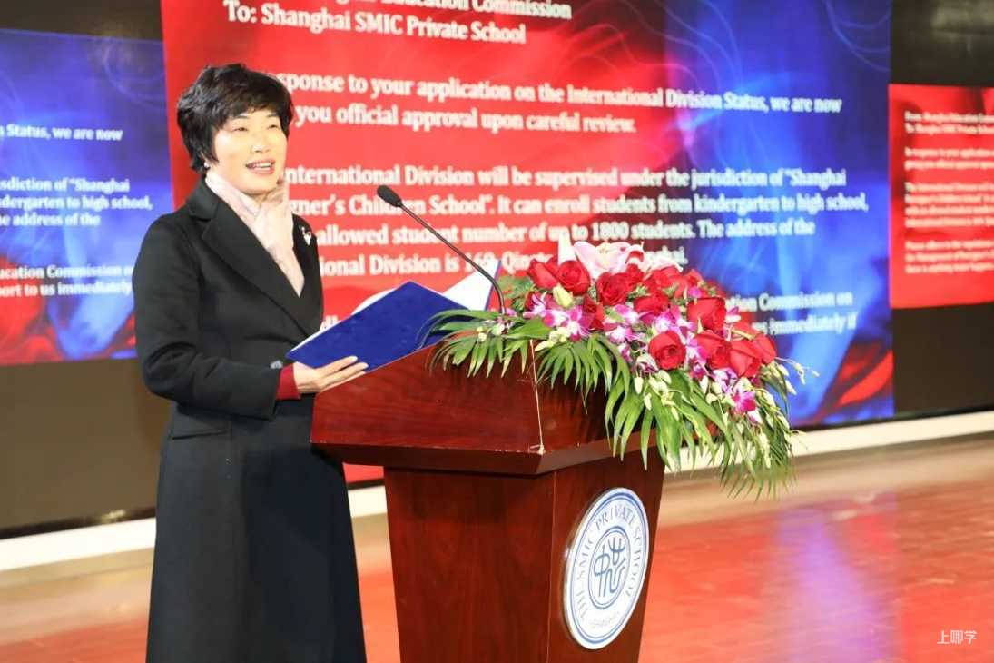 The ceremony started with the national anthem. Then Ms. Shirley Chai, Chief Operations Officer, the host of the ceremony, invited Ms. Lü to the stage to announce the approval from the Shanghai Education Commission of SMIC School’s application for the International Division status.