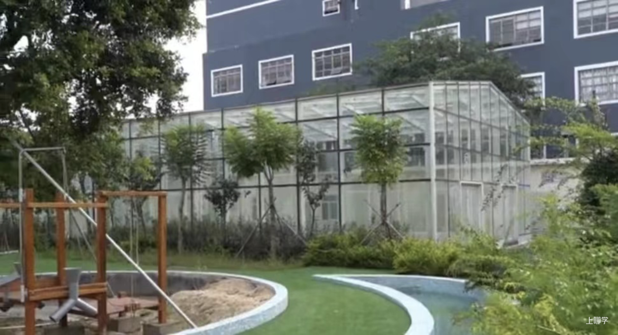 户外各种设施一应俱全。操场、后花园、阳光玻璃房、蹦床、沙池等幼儿园该有的设施一样都没落下。