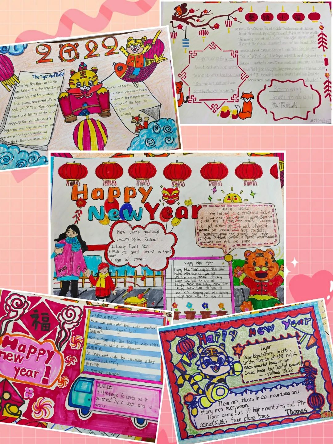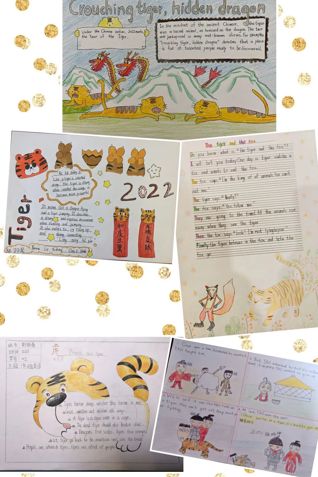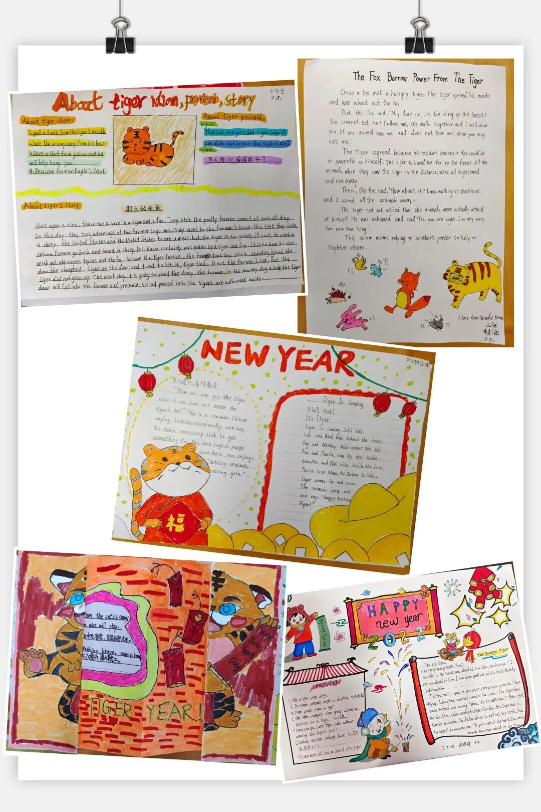 三年级的小朋友们在爆竹声声中迎来了虎虎生威的虎年。虎虎生威,龙腾虎跃,狐假虎威…小朋友们将自己了解的关于老虎的成语 谚语或者故事都搬上了海报,她们翻查资料,动笔画一画写一写,纷纷做出关于虎年的英文小报,图文并茂,生动有趣。请好好欣赏三年级小朋友们的优秀作品吧!