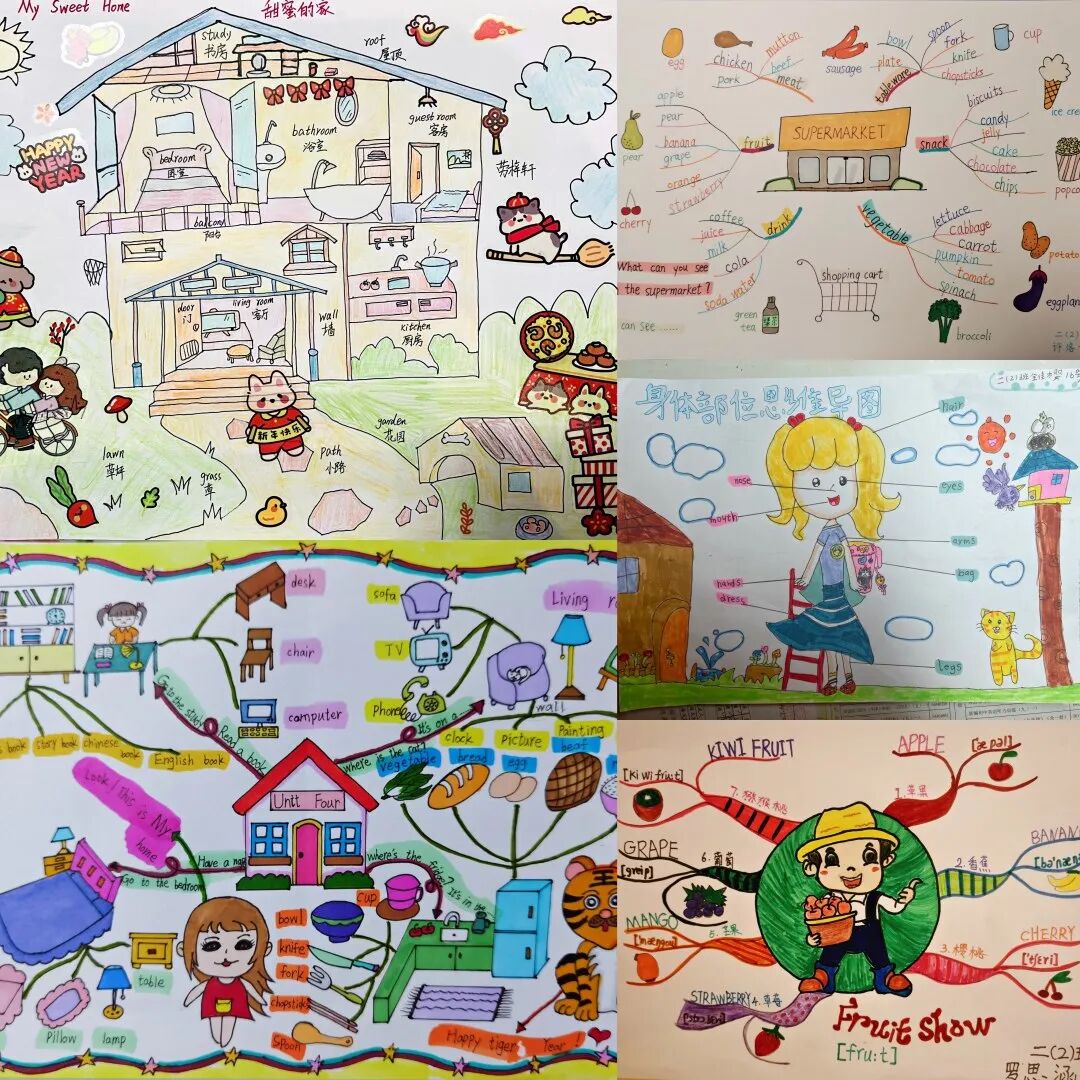 二年级的苗苗们在寒假期间用自己的小手描绘英语学习的快乐。稚嫩的笔触中融合了他们的童真和思维途径。小小的图案体现了他们多维度思考与图形并存的可视法记忆。将脑思维和图形结合起来,充分协调了左脑的逻辑思维和右脑的形象思维。现在让我们一起看看二年级苗苗们的思维导图吧。