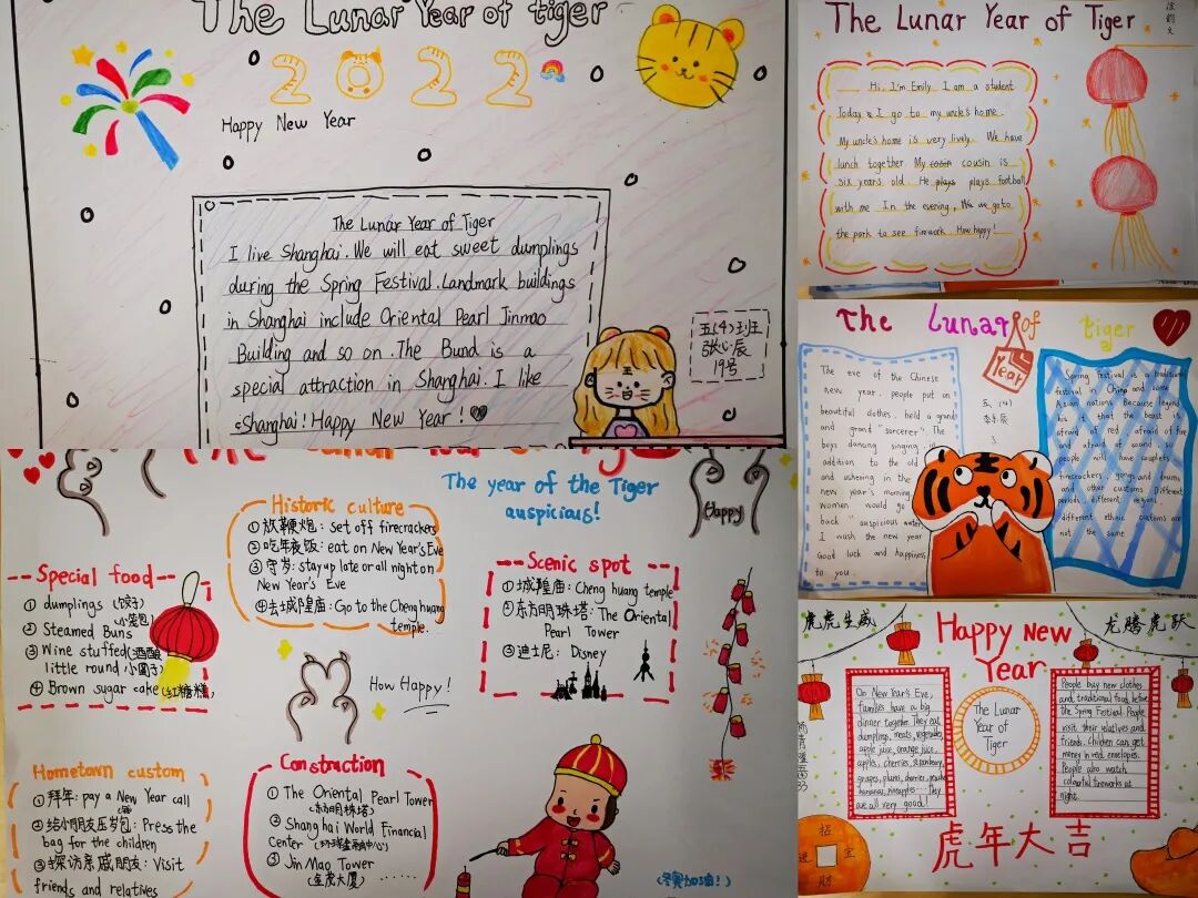 五年级的同学们在寒假期间,搜集有关春节的文化知识,以The Lunar Year of Tiger为主题,通过手抄报的方式介绍春节家乡习俗 、历史文化 、特色美食 、标志性建筑或景点等。与此同时,他们围绕“安全”,用流利的英语讲解春节期间用水安全 用电安全 防疫等注意事项,介绍外出旅游景点或公共场所的安全标识,为春节安全保驾护航。