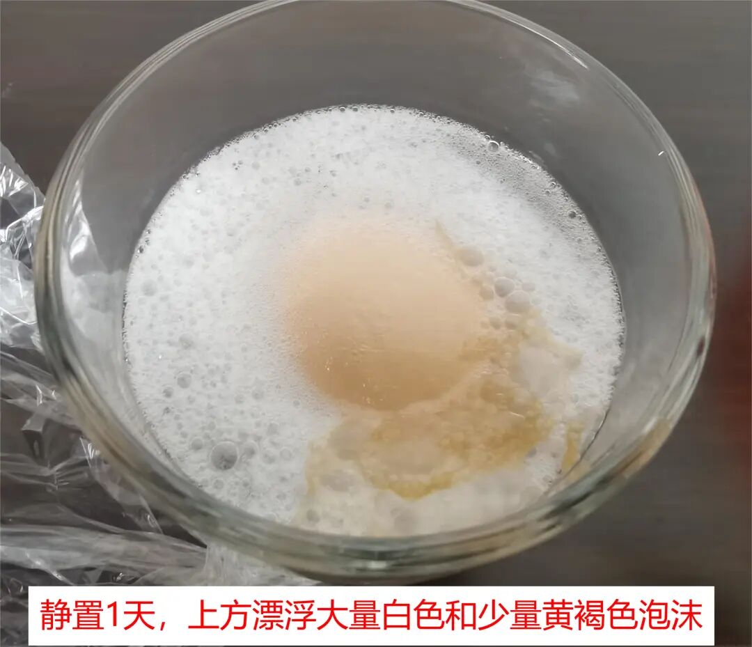 静置1天,打开盖子,蛋壳已软化,鸡蛋已膨胀。若鸡蛋上漂浮着黄褐色泡沫,用小勺子轻轻舀掉,那是蛋壳表面的杂质,若白醋量少了可适当补充后继续密封。