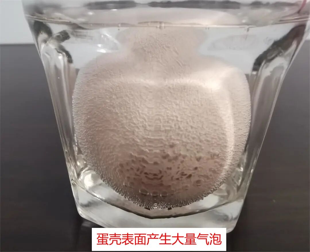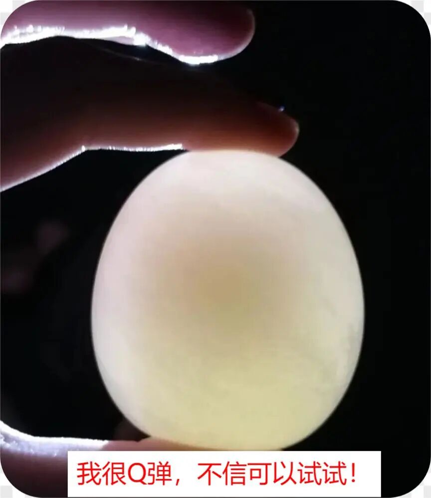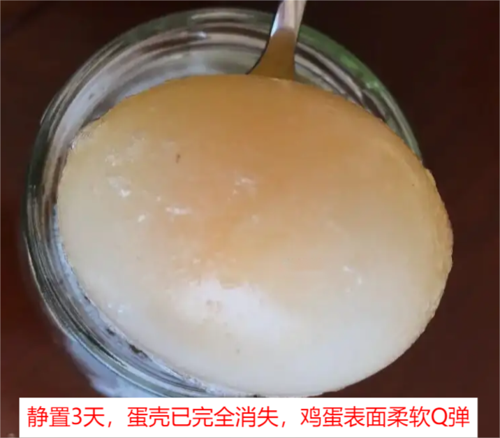 观察到鸡蛋外壳已完全消失,只剩下一层软软的半透明薄膜包裹着内部的蛋清和蛋黄,整个鸡蛋十分柔软Q弹,捏起来就跟弹力球一样。
