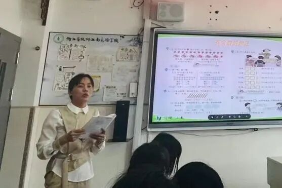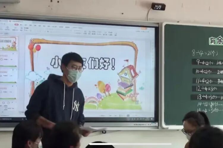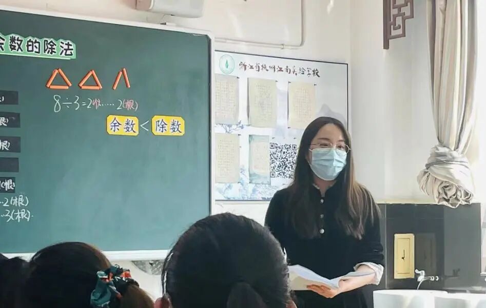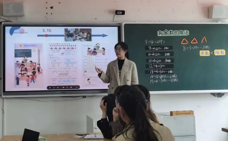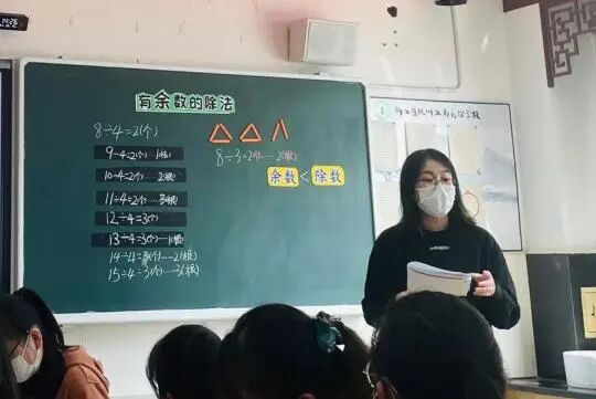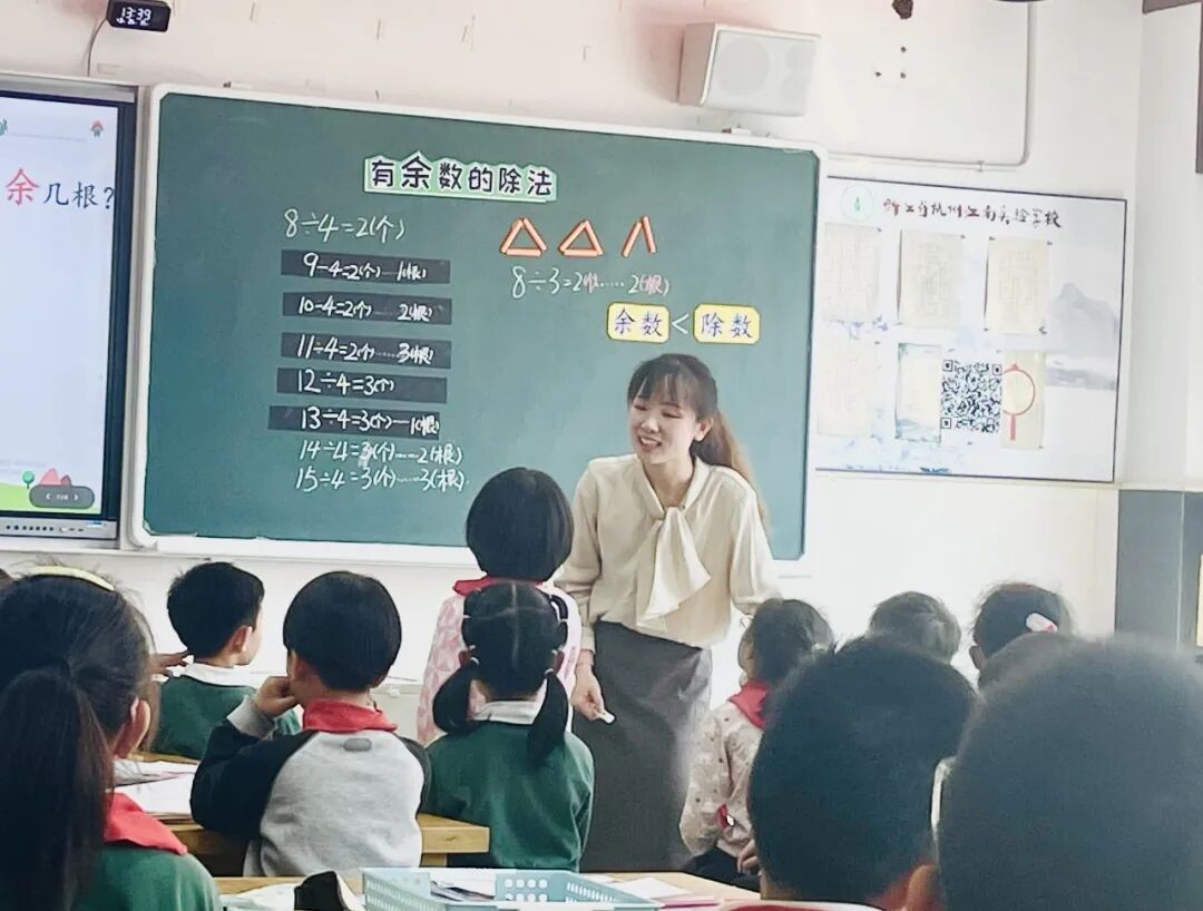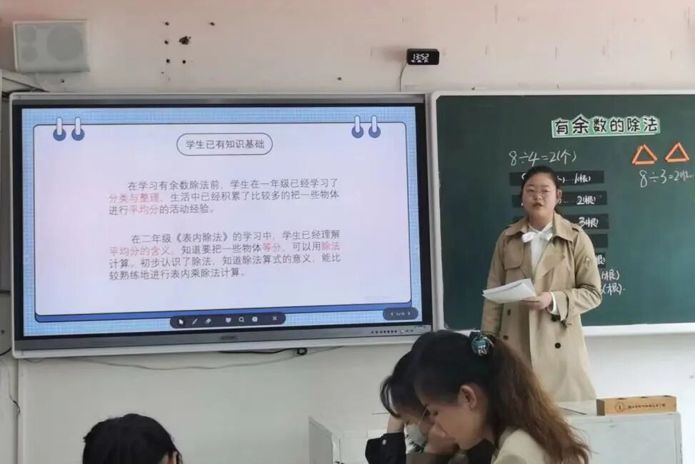 何老师带来《有余数的除法》一课,以课堂中的老朋友——“小棒”贯穿全课,通过摆小棒的活动引导学生发现有余数,学生在探究过程层层递进,有序展开,在对比探究中发掘有余数除法的算式意义,同时何老师及时利用开放式的活动激发学生进一步思考和质疑,在交流探讨中进一步发现余数和除数的关系,随后孩子们还用跳一跳、鼓掌等动作表示余数,“猜一猜”环节引导学生巩固余数与除数的关系,整个课堂中在欢乐活跃的气氛中到达尾声。