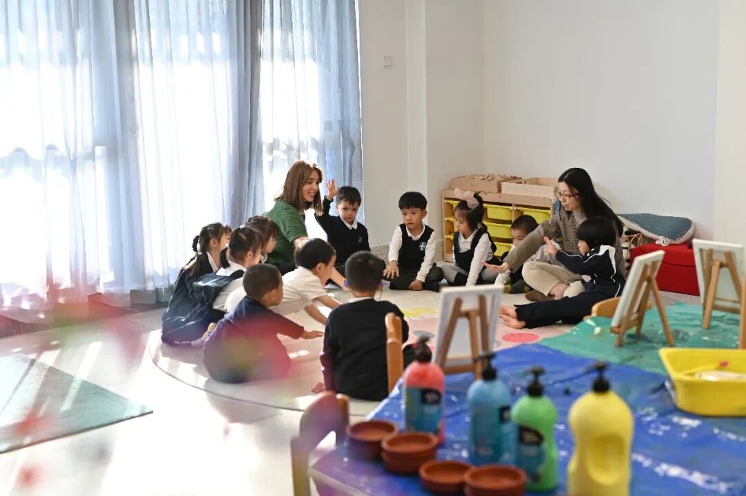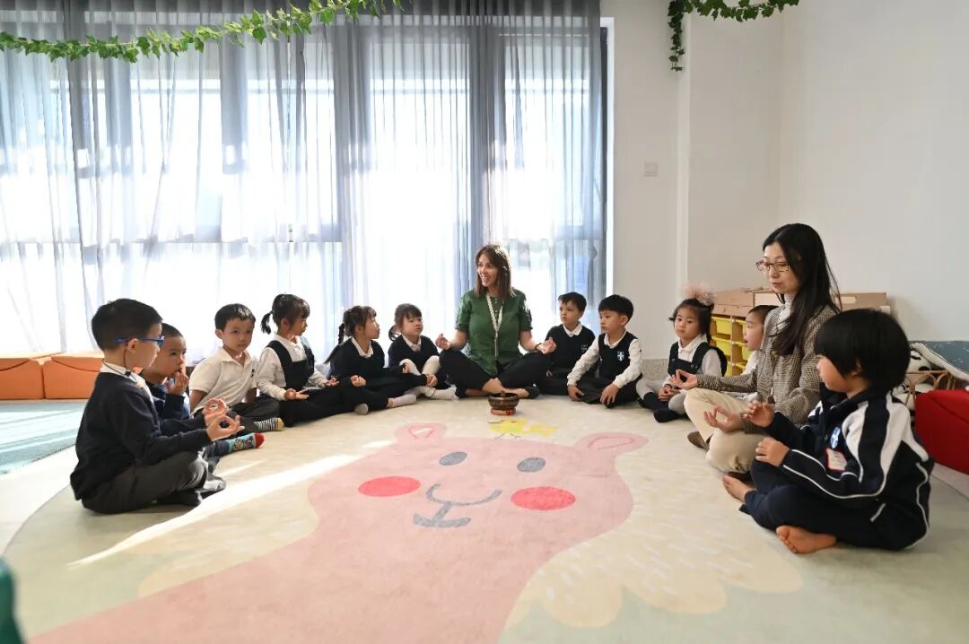 躁动了一天的孩子们,围着Ms. Danielle安静地坐在地上,闭上眼睛,一起跟随她调整呼吸、放松心灵,为一天的校园生活画上美好的句号。