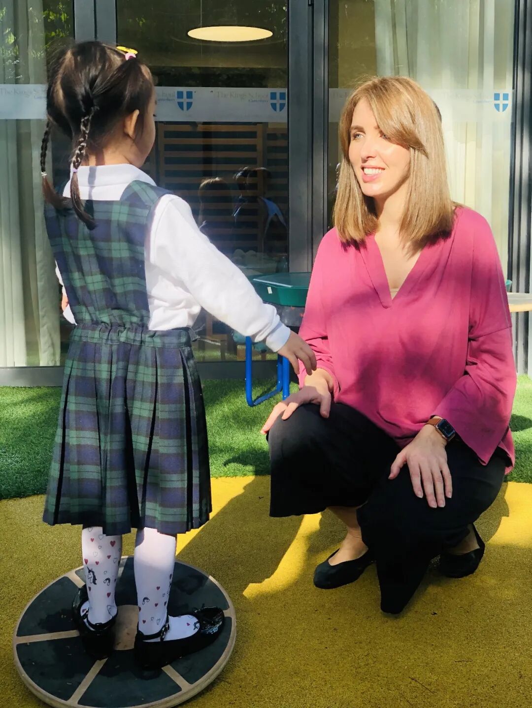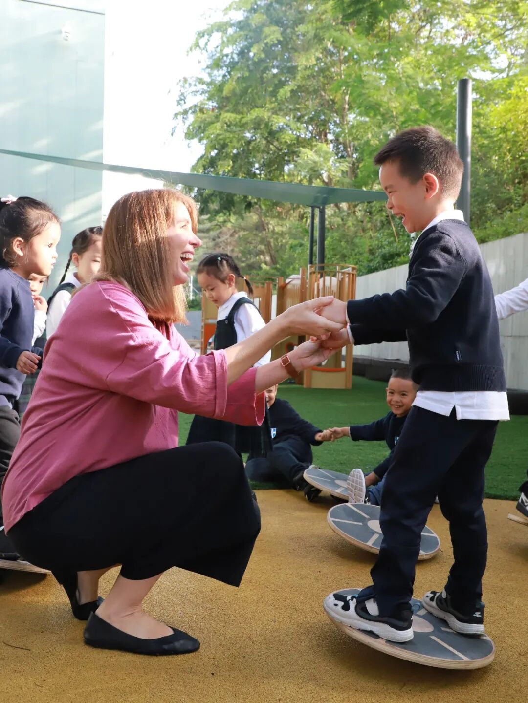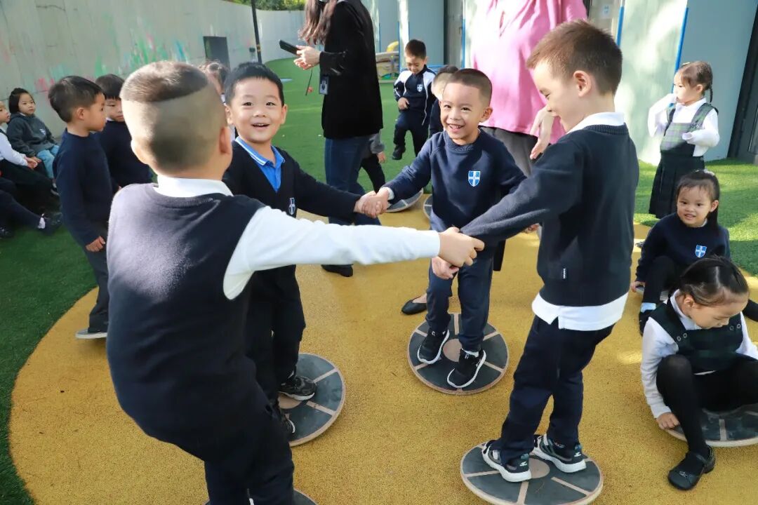 平衡板的使用,非常考验专注力和集中力。Ms. Danielle通过平衡板来帮助孩子建立信心和鼓励正念冥想。对于大多数孩子来说,仅仅站立在平衡板上并使其摆动就需要他们必须全神贯注。
