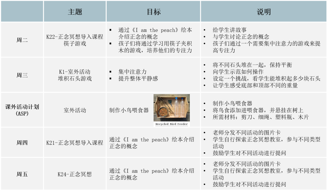 课程活动中,Ms. Danielle还提供很多易操作的正念冥想小游戏,例如记忆象棋、积木、陀螺、记忆石、筷子堆叠等。她以一种有趣的方式使用这些具有吸引力的活动来帮助孩子们平静下来,更容易集中注意力并关注当下。所有这些活动都遵循正念冥想的原则,每一个游戏玩具也都可以帮助孩子们提升整体的平静感。