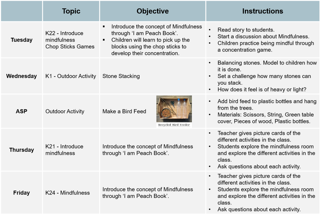 example of a week's schedule for mindfulness