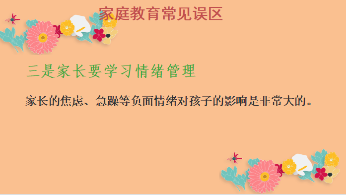 家长忙于工作,对孩子缺少必要的关怀,孩子在迷茫时得到不亲情的关怀和引导就会误入歧途,有时还会酿成非常严重的后果。让所有家长认识到这一现状后,胡老师接着讲述了家庭教育的误区。
