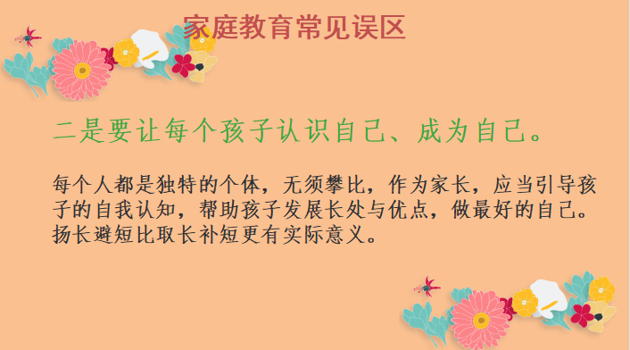 胡老师指出:在中国每一个家长都有一颗望子成龙,望女成凤的心。而面临严峻的升学压力,很多父母,就把目光聚焦在孩子的学习成绩这一点上,对孩子要求苛刻,导致亲子关系紧张。其实每个人都是独特的个体,无须攀比,作为家长,应当引导孩子自我认知,帮助孩子发展长处与优点,做最好的自己。扬长避短比取长补短更有实际意义。