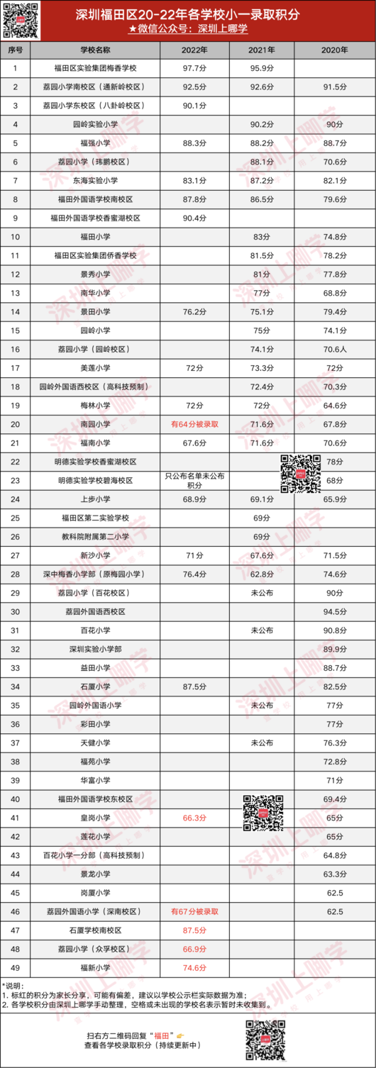 另外,幼升小君在家长群里收集到了家长分享的部分公布录取积分的学校(持续更新中),汇总成了下面的表格,家长可以收藏此表格,扫表格内二维码回复“福田”,即可查看最新更新的各学校录取分数线👇: