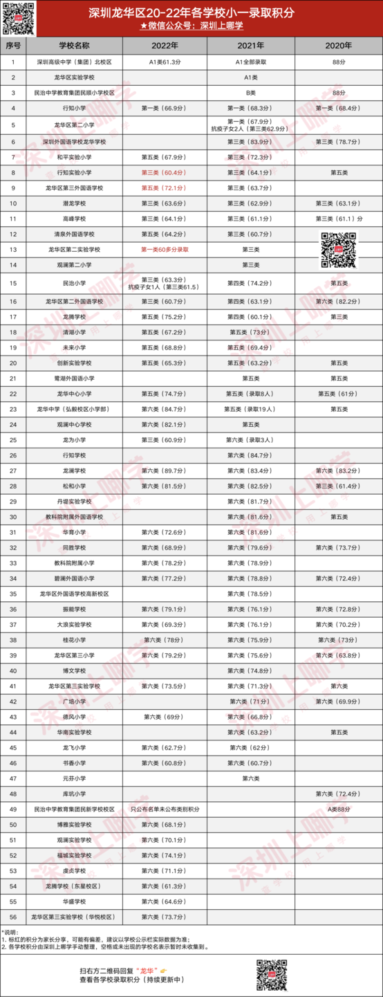 幼升小君在家长群里收集到了家长分享的部分公布录取积分的学校(持续更新中),汇总成了下面的表格,家长可以收藏此表格,扫表格内二维码回复“龙华”,即可查看最新更新的各学校录取分数线👇: