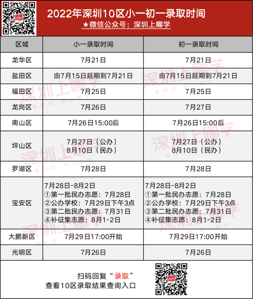 以下是其他区录取结果公布时间,家长一定要记住查看录取结果的时间,如果实在记不住,可以保存2022年深圳各区录取查询时间表!