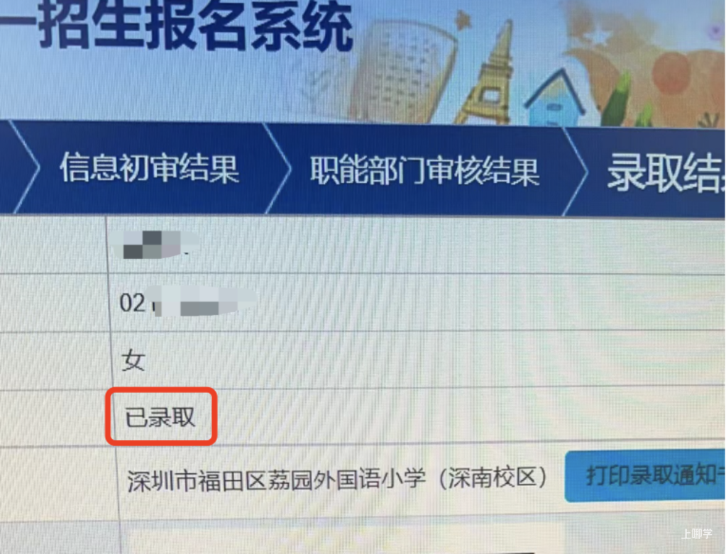 注意⚠️:如果家长未被录取,被分流到其他学校,也是可以在报名系统上查询到的,比如有的龙华家长报名的是龙华区实验学校分流到玉龙学校,民治小学分流到华南实验学校等。