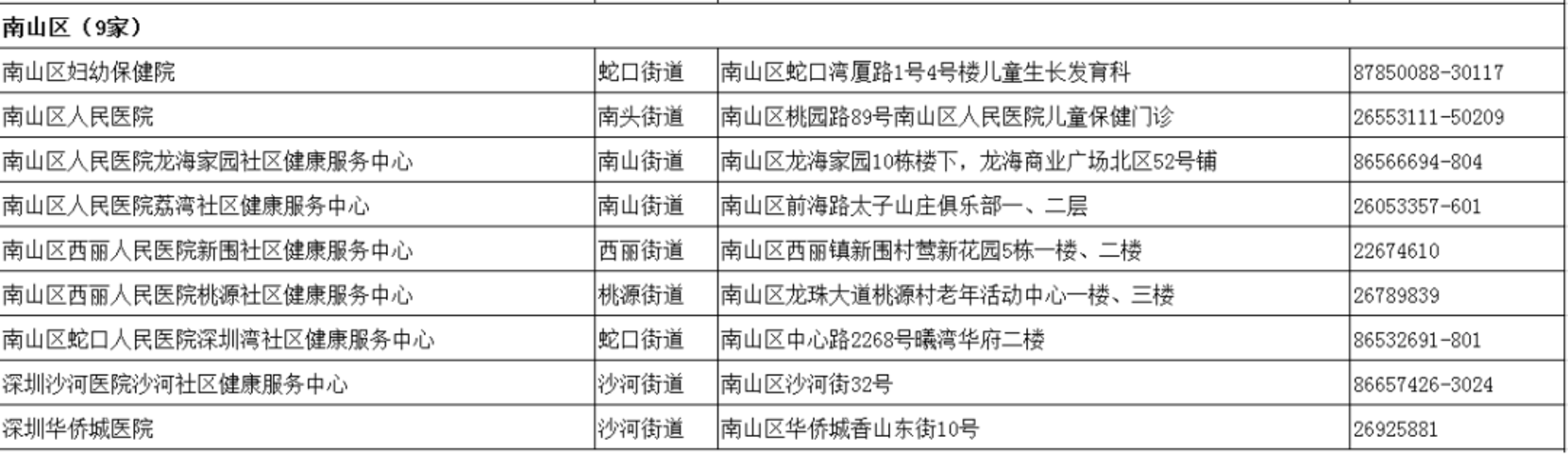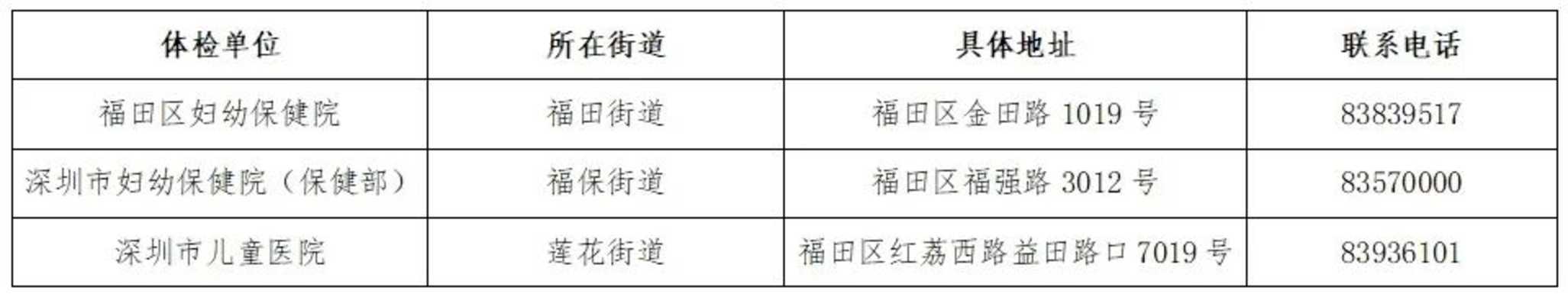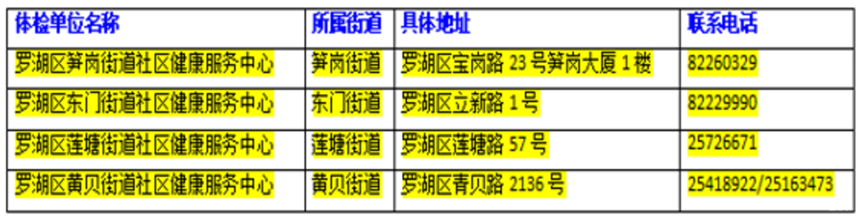 罗湖区妇幼保健院、莲塘街道社康中心、笋岗社康中心、东门街道社康中心、黄贝街道社康。
