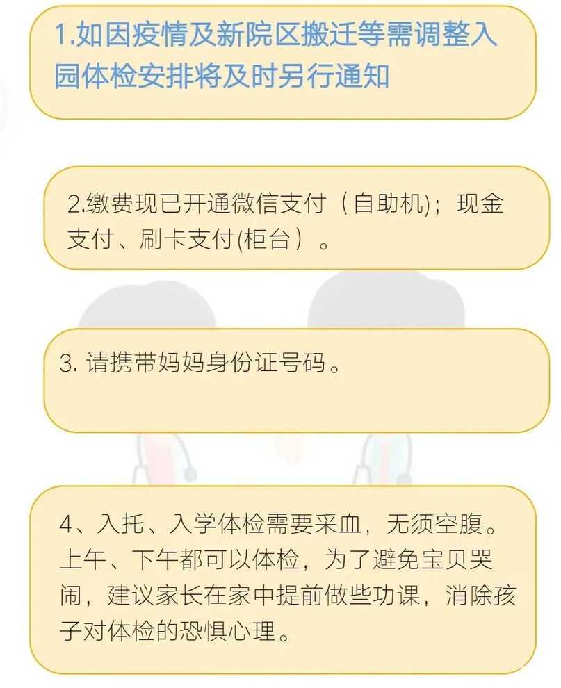 需要注意的是,不同的园所体检要求有细微差别哦,部分除了指定地点和时间外,还会要求加查一项!如果不按园所通知要求来,很有可能会重新体检!