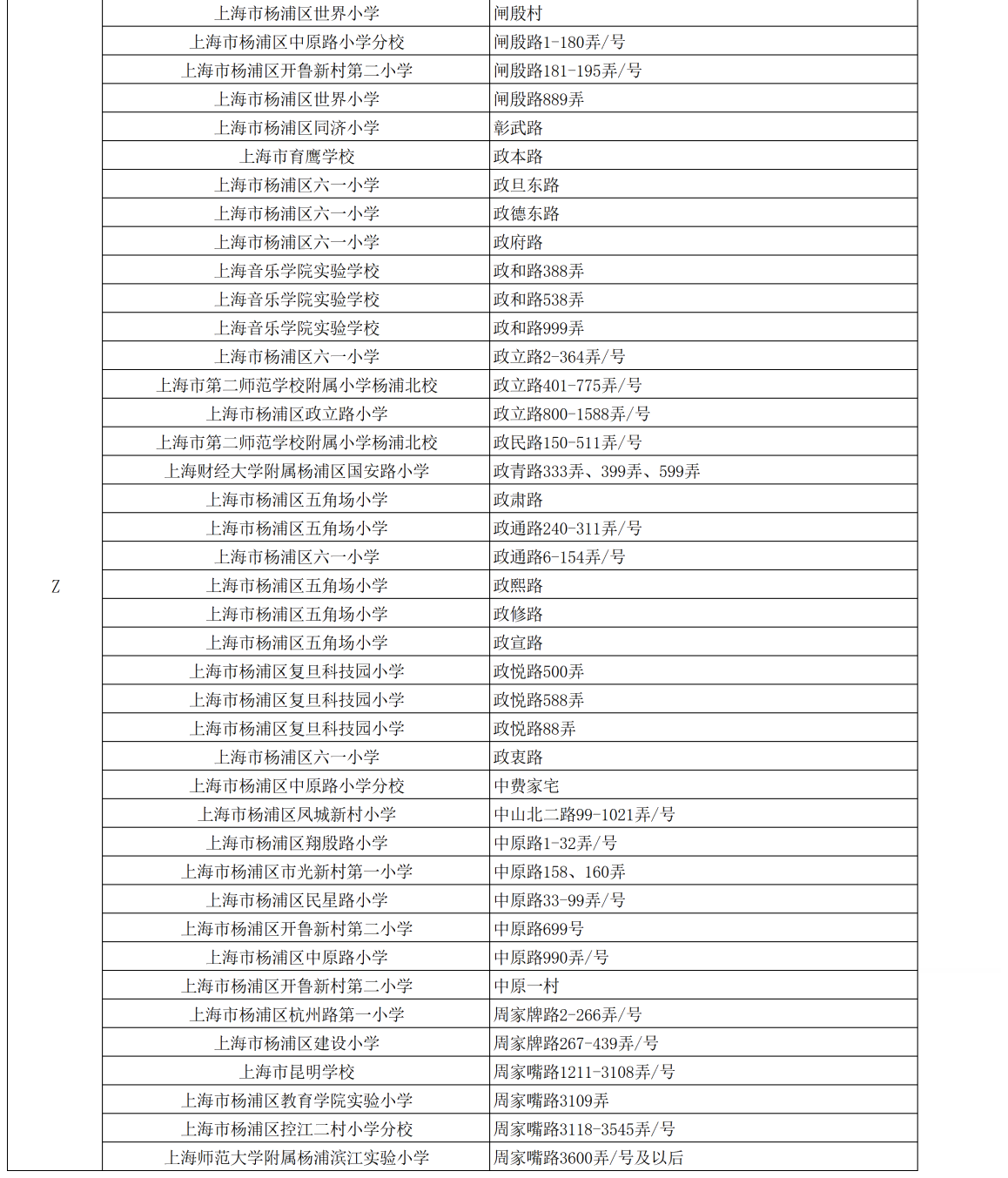 2024年杨浦区一年级新生招生范围