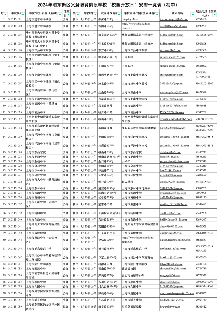 文章-2024年浦东新区义务教育阶段学校“校园开放日”安排一览表(初中)