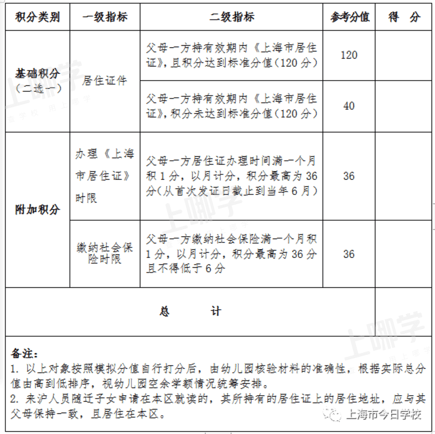 3、父母一方持有效期内《上海市居住证》(居住证上的居住地址在本区)且积分达标准分值的适龄幼儿:
