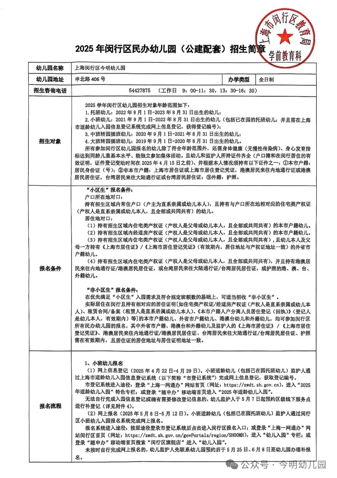 01 招生对象:年龄在2-6岁的健康幼儿。 02 收费标准: 管理费: 非小区生:3800元/月 小区生(小中大班):330元/月 小区生(托班)3800*7折/月 03 招生咨询电话: 报名咨询电话:54427891*8108(园长室)/8102(保健室) 04 报名时间地点: 网上信息登记:2020年4月24日-4月30日(小班适龄幼儿 ) 网址:https://shrydj.edu.sh.cn,也可通过“一网通办”进入 网上报名:2020年5月11日-5月17日 (小班适龄幼儿) 网址:https://yebm.mhedu.sh.cn,下载打印《2020年闵行区幼儿园小班幼儿报名表》 现场报名验证:2020年5月30日-5月31日(小班适龄幼儿) 地点:今明幼儿园 上幼儿园,是每个小宝贝的人生第一次, 将第一时间在公众号内发布