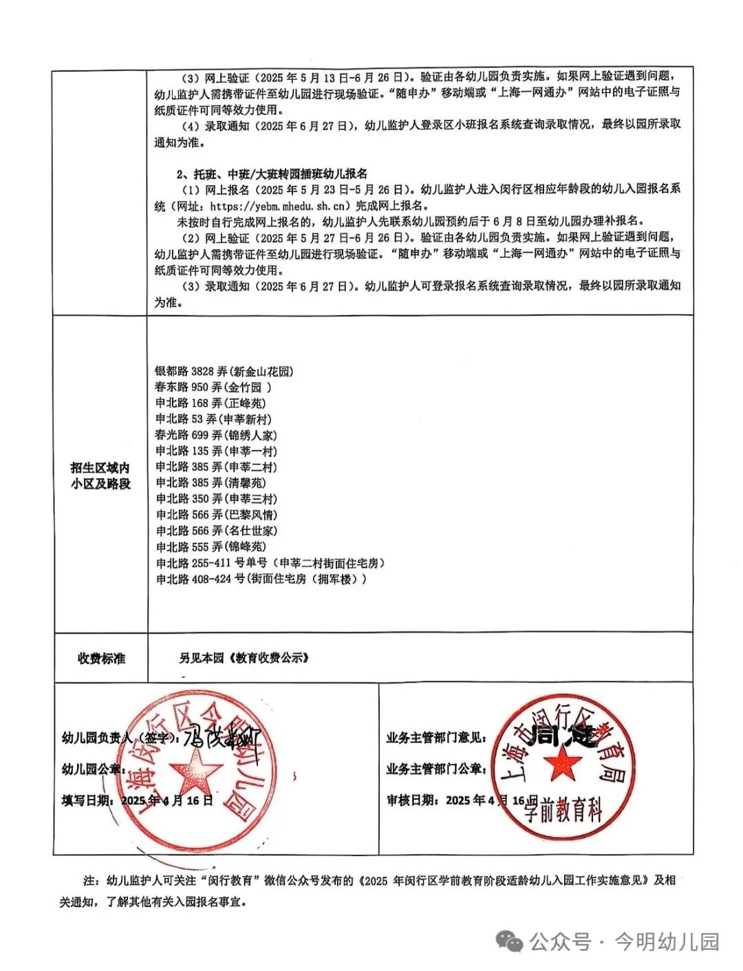 (4)录取通知(2025 年 6 月 27 日),幼儿监护人登录区小班报名系统查询录取情况,最终以园所录取 通知为准。 注:幼儿监护人可关注“闵行教育”微信公众号发布的《2025 年闵行区学前教育阶段适龄幼儿入园工作实施意见》及相 关通知,了解其他有关入园报名事宜。