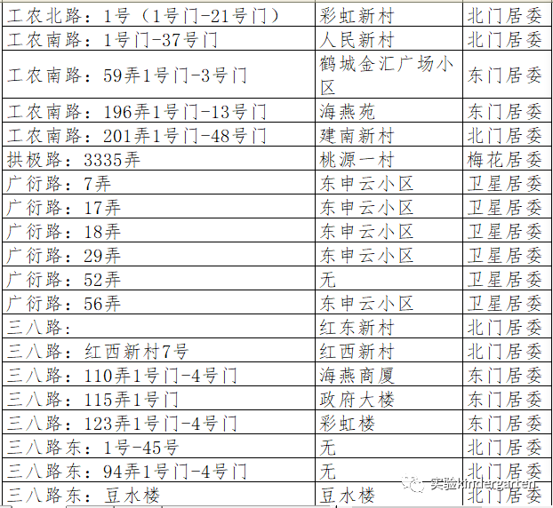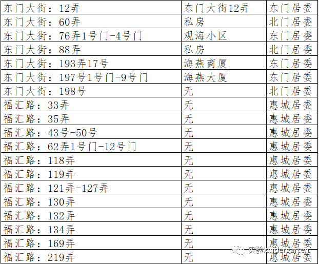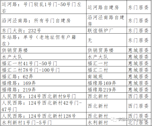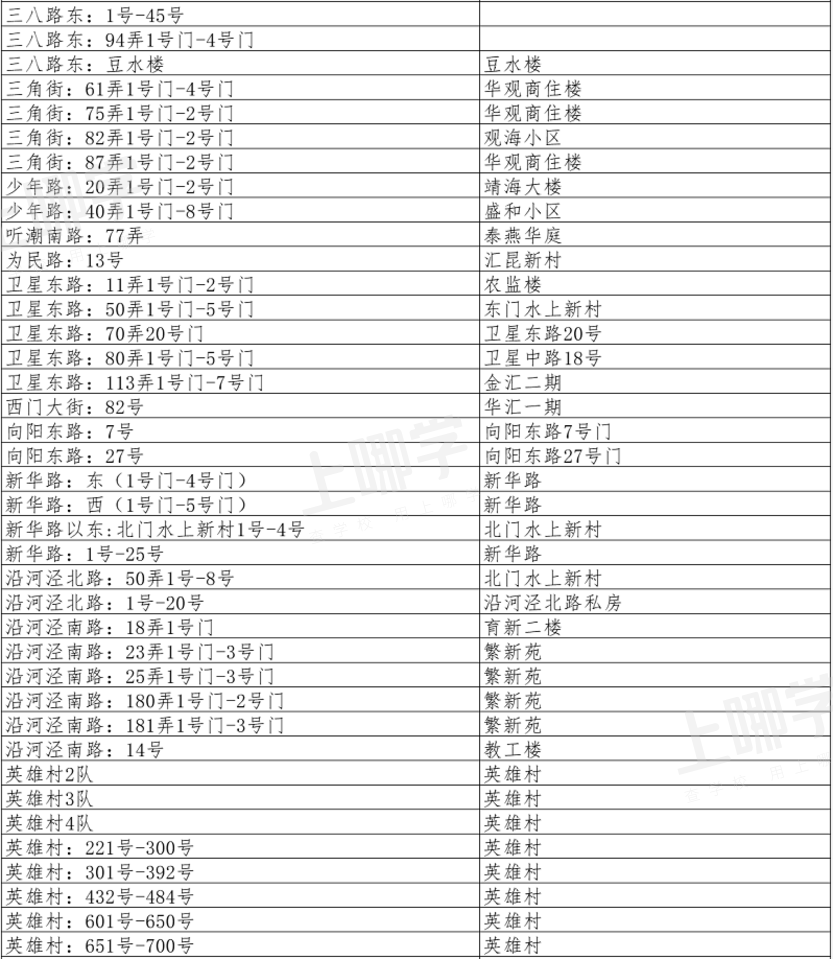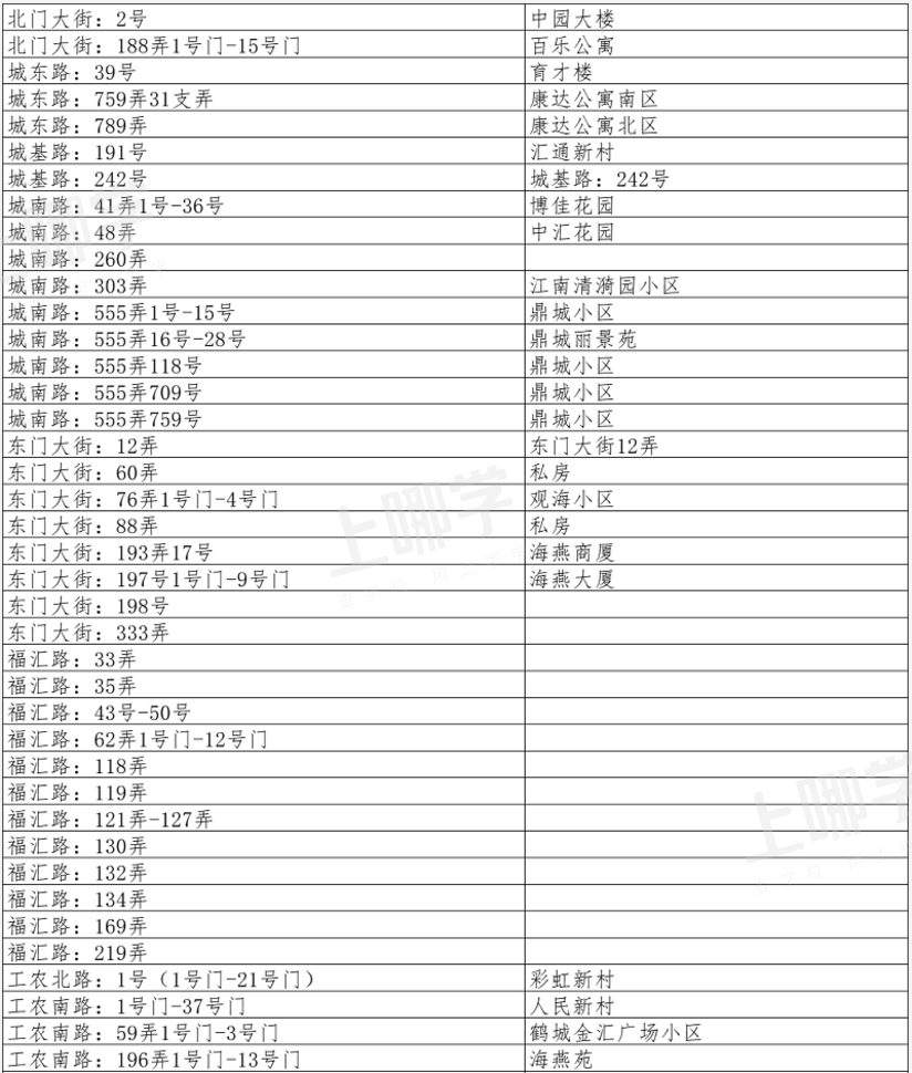城东路:759弄31支弄、城东路:789弄、梅花路:138弄、梅花路:168弄、黄家宅、梅花路:169弄、梅花路:177弄、梅花路:219弄、梅花路:235弄、梅花新村、拱极路:3335弄、惠北新村:1-15号、马家宅人民路:49弄、工农北路:1-21号门、工农北路:1-6号门、北门大街:188弄1号门-15号门、为民路:13号1-6幢、游泳池路、解放路:27号门-32号门、解放路:115弄、人民西路:124号、北门大街:1号、北门大街:32-60号、北门大街:69号、城东路:39号、城基路:191号、城基路:242号、城南路:41弄1号-36号、城南路:48弄、城南路:260弄、城南路:303弄、城南路:555弄1号-15号、城南路:555弄16号-28号、城南路:555弄118号、城南路:555弄709号、城南路:555弄759号、东门大街:60弄、东门大街:76弄1号门-4号门、东门大街:88弄、东门大街:193弄17号、东门大街:197号1号门-9号门、东门大街:198号-200号、东门大街:333弄、东门大街:420弄、福汇路:33弄、福汇路:35弄、福汇路:62弄1号门-12号门、福汇路:118弄、福汇路:119弄、福汇路:121弄-127弄、福汇路:130弄、福汇路:132弄、福汇路:134弄、工农南路:1号门-37号门、工农南路:59弄1号门-3号门、工农南路:196弄1号门-13号门、工农南路:201弄1号门-48号门、工农南路:220弄、工农南路:420弄、工农南路:9号、广衍路:7弄、广衍路:17弄、广衍路:18弄、广衍路:29弄、广衍路:47弄、广衍路:51弄、广衍路:52弄、广衍路:53弄、广衍路:55弄、广衍路:57弄、广衍路:58弄、广衍路:59弄、广衍路:62弄、广衍路:63弄、广衍路:65弄、广衍路:45号、49号、50号、53号、57号、61号、三八路:红西新村7号、三八路:红东新村、人民西路:北门新村6号门-9号门、人民西路:北门新村16号门-18号门、南门大街:21弄、南门大街:70弄14支弄1号门-19号门、南门路:88支弄、南门路:150弄55支弄、南门路:238弄、南门新村:4号-6号、水利新村:6号门-10号门、农场路:13号、农场路:16号、农场路:10号、农工村所有门牌号、城东路:671弄1号门-3号门、人民路北门大街交汇处:北门新村1号门-5号门、人民东路:3029弄1号门-17号门、人民西路:87号、人民路50-66号、人民西路:141弄、三八路:110弄1号门-4号门、三八路:115弄2号、三八路:123弄1号门-4号门、三八南路:1弄、三八路东:1号-45号、三八路东:94弄1号门-4号门、三八路东:豆水楼、三角街:61弄1号门-4号门、三角街:75弄1号门-2号门、三角街:82弄1号门-2号门、三角街:87弄1号门-2号门、少年路:20弄1号门-2号门、少年路:40弄1号门-8号门、听潮南路:77弄、卫星东路:11弄1号门-2号门、卫星东路:50弄1号门-5号门、卫星东路:70弄1号门、卫星东路:80弄1号门-5号门、卫星东路:113弄1号门-7号门、汇华路:1弄、汇华路:2弄、向阳东路:7号、向阳东路:27号、新华路:东(1号门-4号门)、新华路:西(1号门-5号门)、新华路以东:北门水上新村1号-4号、新华路:1号-25号、沿河泾北路:50弄1号-8号、沿河泾北路:1号-20号、沿河泾南路:18弄1号门、沿河泾南路:23弄1号门-3号门、沿河泾南路:25弄1号门-3号门、沿河泾南路:180弄1号门-2号门、沿河泾南路:181弄1号门-3号门、沿河泾南路:14号、英雄村2队、英雄村3队、英雄村4队、英雄村:221号-392号、英雄村:432号-484号、英雄村:601号-991号、英雄新村:1109号、英雄路:51弄、英雄路:1号-73号、英雄路:英雄小住宅、油(尤)车场即运河路125弄所有号门、育新一楼:1号-2号、育新四楼、育新楼1号、2号、育新楼4号、跃进路:48号、运河路:121弄1号门-2号门、惠南镇摇荡湾弄、南粮新村:1号门-8号门、跃进路、工业新村:1号门-7号门、车站大楼:1号门-2号门、听潮路:69弄、南园路:99弄、三角街:所有门号自建房、卫星东路:1号门-58号门、运河路:1号门-50号门、沿河泾南路:所有号门自建房、东门大街:232号、车站路:单号、供销贸易楼、水产大队、福汇一村:43号门-50号门、福汇二村:78号门-100号门、福缘路:169弄、福缘路:219弄、人民西路:124号西北新村42号门-47号门、水利新村:1号门-5号门、城南路:395号、399号、南门大街:148号、150号、156号