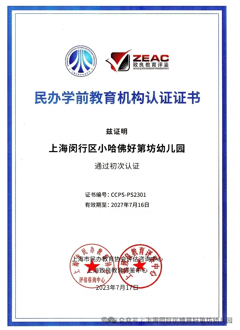 上海闵行区小哈佛好第坊幼儿园成立于2007年9月,是一所全日制民办二级一类幼儿园,至今已有14年园史。我园2017、2018学年度被评为上海市安全文明校园,2020年荣获上海市民政局中国社会组织评估等级4A级社会组织单位。