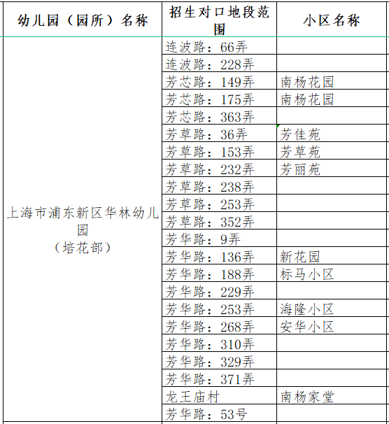 华林幼儿园 招 生 啦 根据《浦东新区教育局关于2023年本区学前教育阶段适龄幼儿入园工作的实施意见》,结合本园实际,为公开、公平、公正做好浦东新区华林幼儿园2023年小班招生入园工作,现将有关事项告示如下: 聚华成林 和谐共生 一、招生范围 1 浦东新区华林幼儿园(芳波部) 2 浦东新区华林幼儿园(培花部) 本部为“人才公寓(芳草路15号)”提供线上验证服务 3 浦东新区华林幼儿园(由由部) 二、招生计划 2023年华林幼儿园(芳波部)计划招收小班5个班 2023年华林幼儿园(培花部)计划招收小班3个班 2023年华林幼儿园(由由部)计划招收小班3个班 三、招生对象 1.2023年小班招生入园对象: 2019年9月1日—2020年8月31日期间出生,年满3周岁的适龄幼儿。 2.小班适龄幼儿入园报名须符合以下条件之一: ①本区户籍、人户一致的适龄幼儿:按幼儿本区常住户籍地址对口入园。须持有2023年4月27日前办理的招生区域内户籍和相对应的住宅类房产证。户主为幼儿的父母、祖父母或外祖父母之一,且户主本人须为房屋产权人(单独所有或共同共有全部产权);幼儿本人为户主的,房屋产权人须为幼儿本人(单独所有或共同共有全部产权)或其父母(单独所有或共同共有全部产权)。当入园适龄幼儿人数超出幼儿园招生计划数,按照幼儿户籍迁入时间先后排序入园,超额部分作统筹安排。 ②本市户籍、人户分离(居住地具备相应房产证)的适龄幼儿:按房产证地址就近入园。须持有2023年4月27日前办理的招生区域内住宅类房产证。房屋产权人须为幼儿本人(单独所有或共同共有全部产权)或其父母(单独所有或共同共有全部产权)。待区域内户籍与房产一致的幼儿安排后,视幼儿园招生情况,按房产证地址就近安排入园。当入园适龄幼儿人数超出幼儿园招生计划数,按照幼儿户籍和产证情况排序入园,超额部分作统筹安排。 本市户籍廉租房或经济适用房(承租人或买受人须是幼儿父母)的适龄幼儿参照执行。 ③本市外区户籍、人户分离(在居住地无相应房产证)的适龄幼儿:本市外区户籍的幼儿确有困难,不能在户籍地入园,凭街(镇)社区事务受理服务中心出具的《本市户籍人户分离人员居住登记(回执)》,按居住地统筹安排入园。 ④父母一方持有效期内《上海市居住证》(居住证上的居住地址在本区)且积分达标准分值的适龄幼儿:须持有2023年4月27日前办理的招生区域内住宅类房产证,房屋产权人须为幼儿本人(单独所有或共同共有全部产权)或其父母(单独所有或共同共有全部产权)。参照本市户籍、人户分离(居住地具备相应房产证)的幼儿,按房产证地址就近入园。当入园适龄幼儿人数超出幼儿园招生计划数,按照幼儿及父母居住证和产证情况排序入园,超额部分作统筹安排。无房产证的,凭本区合法居住证明,统筹安排入园。 ⑤动迁户适龄幼儿:因动迁原因,户籍尚未迁移至安置地的或居住的安置房产尚未办理产证的,如动迁安置地配套幼儿园已具备招生条件,可凭动迁协议书安置地址就近安排入园。租赁房屋居住的,凭本区合法居住证明,统筹安排入园。 ⑥其余符合入园条件的来沪人员适龄随迁子女:幼儿本人须持有效期内《上海市居住证》或《居住登记凭证》,父母一方须持有效期内《上海市居住证》,且一年内(2022年7月1日至2023年6月30日)参加本市职工社会保险满6个月(不含补缴,有关政策允许补缴的除外)或连续3年(从首次登记日起至2023年6月30日)在街镇社区事务受理服务中心办妥灵活就业登记。 来沪人员适龄随迁子女,申请在本区就读的,其所持的居住证上的居住地址,应与其父母保持一致,且居住地址在本区。持有2023年4月27日前办理的招生区域内住宅类房产证的,房屋产权人须为幼儿本人(单独所有或共同共有全部产权)或其父母(单独所有或共同共有全部产权),按房产证地址,统筹安排入园。无房产证的,凭本区合法居住证明,根据各公民办幼儿园第一批报名验证情况,统筹安排至尚有余额的公办幼儿园或民办三级幼儿园。幼儿园可按照“浦东新区来沪人员随迁子女统筹入园积分表”分值高低排序,视学位情况统筹安排入园。 ⑦香港、澳门、台湾适龄幼儿:香港、澳门幼儿须持本人香港或澳门永久居民身份证、港澳居民来往内地通行证和本市《境外人员住宿登记表》或《中华人民共和国港澳居民居住证》;台湾幼儿须持本人台湾居民来往大陆通行证和本市《境外人员住宿登记表》或《中华人民共和国台湾居民居住证》,统筹安排入园。 ⑧外籍适龄幼儿:外籍幼儿须持本人有效签证外国护照(须有中华人民共和国外国人居留许可页,且有有效往来签证)和本市《境外人员住宿登记表》,统筹安排入园。 ⑨特殊幼儿:有特殊教育需求的幼儿须持有本区户籍,可向爱心幼儿园或上南三村幼儿园、童心幼儿园、临港新城海音幼儿园、致立学校申请入读学前特教班。 ⑩其他符合入园条件的幼儿:除上述情况以外,其他符合在本区入园条件的幼儿,视实际情况统筹安排入园。 四、网上报名验证时间及办法 1.网上报名 2023年5月8日-5月14日,适龄幼儿监护人通过“上海市浦东新区适龄幼儿入园报名平台”(登录上海“一网通办”网站首页“2023年适龄幼儿入园”特色专栏,网址:https://zwdt.sh.gov.cn,或登录“随申办”移动端首页“2023年适龄幼儿入园”)完善信息并进行统一的网上报名,获取《2023年浦东新区幼儿