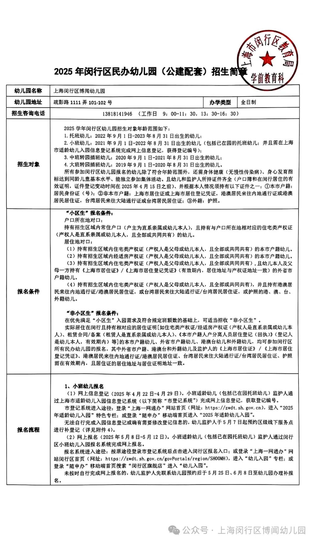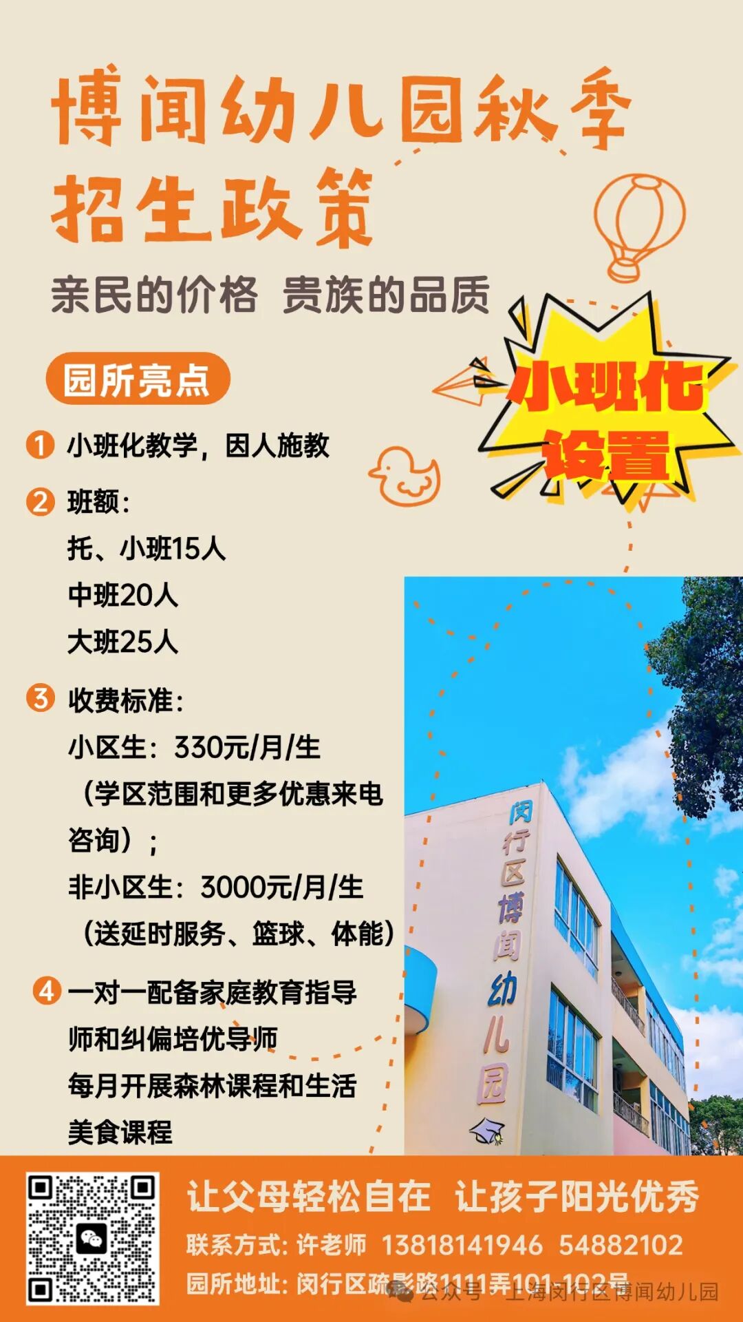 您好!上海闵行区博闻幼儿园2025年秋季开始招生啦,幼儿园是孩子步入社会的第一道门,从这一刻起,迈出了家庭小天地,走进了丰富多彩的幼儿园集体生活。选择我们就选择了美好与信任!期待小朋友们在博闻幼儿园大家庭里健康快乐成长,拥有一个美好的童年!