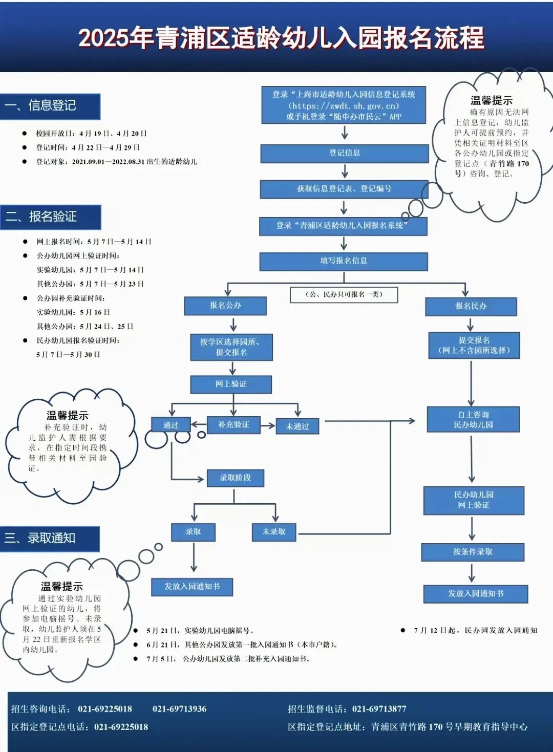 阶段二:报名验证(5月7日-5月14日),已完成信息登记的家长,在我区入园政策规定的时间段内,登录市登记系统,点击青浦区报名入口进行报名,适龄幼儿家长须在5月7日-14日期间,登录“青浦区适龄幼儿入园报名平台”,自主选择公办或民办幼儿园提交报名(公、民办只可报名一类)。5月7日-5月30日各幼儿园进行网上验证。请家长及时关注报名验证时间及入园政策细则,按要求进行办理。
