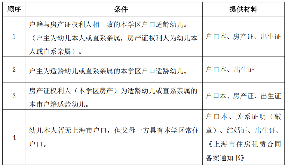 人户一致。户主及房产证权利人为幼儿本人或直系亲属。 户主为适龄幼儿或直系亲属 房产证权利人为适龄幼儿或直系亲属 幼儿本人暂无上海市户口,但父母一方具有本区常住户口 父母一方持有效期内上海市公安局统一签发的《上海市居住证》且积分达到120分标准分值,并持有招生区域内房产或具合法租住证明,幼儿持有效期内《上海市居住证》或《居住登记凭证》 父母一方持有效期内《上海市居住证》,且一年内参加本市职工社会保险满6个月(2019年7月1日至2020年6月30日,不含补缴),或连续3年(从首次登记日起至2020年6月30日)在街镇社区事务受理服务中心办妥灵活就业登记,并持有招生区域内房产或具合法租住证明,幼儿持有效期内《上海市居住证》或《居住登记凭证》 港、澳、台地区及外籍幼儿。法定监护人在本区合法任职或就业、并已在本区购房或合法租住。